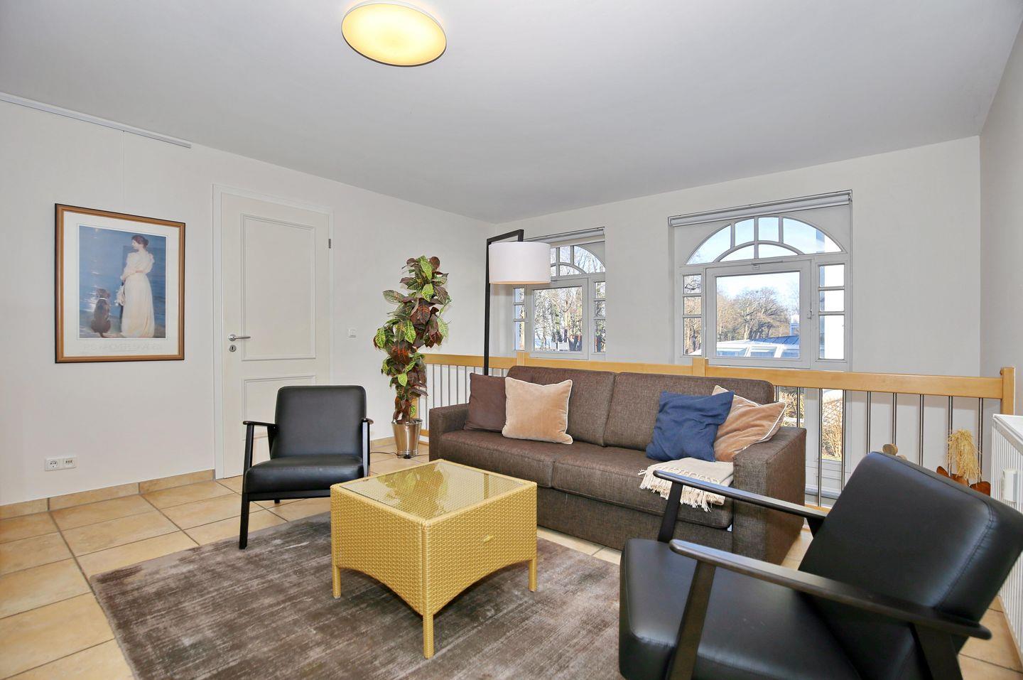 Im Relax-Bereich im 1. Obergeschoss befinden sich eine Schlafcouch und ein Flachbild-TV. Der Fußboden hier ist gefliest.