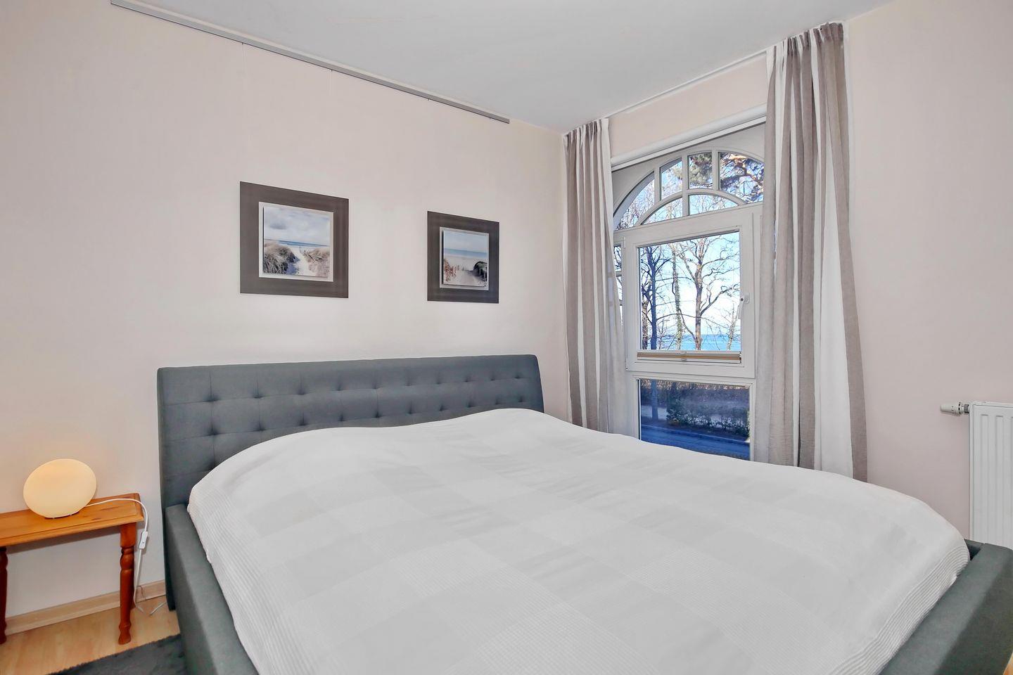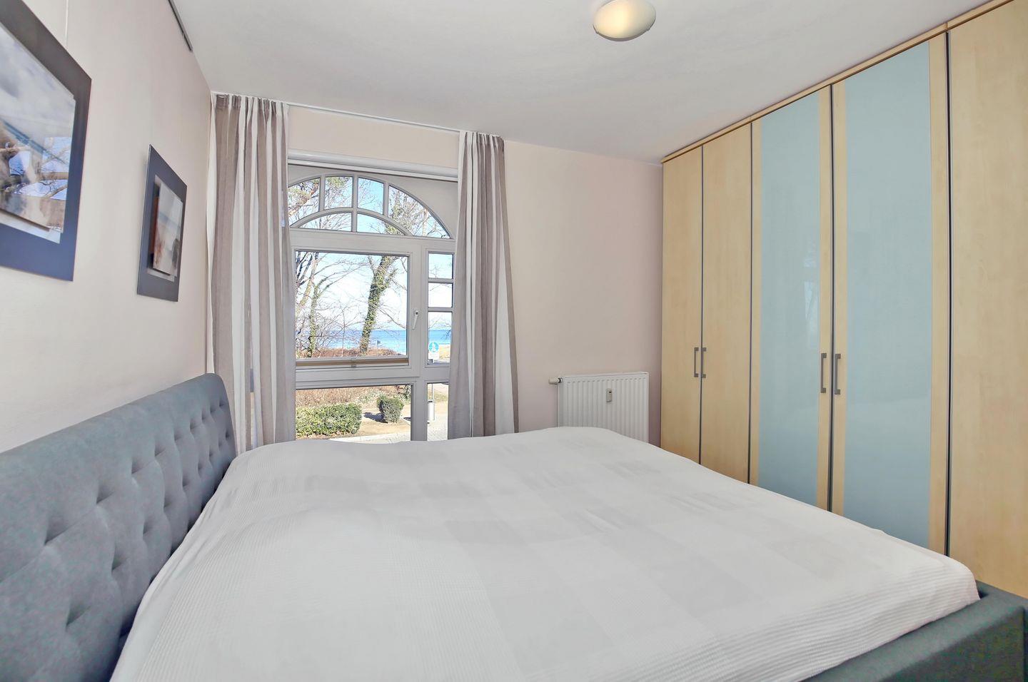 Das 1. Obergeschoss erreichst du über eine Treppe. Dort befindet sich das Schlafzimmer der Ferienwohnung. Es erwartet dich ein Doppelbett (2 x 90 x 200 cm) zur erholsamen Nachtruhe mit Blick auf die Ostsee. Ein Kleiderschrank bietet dir ausreichend Stauraum für deine Sachen. Der Fußboden ist mit Laminat verlegt. Als Sichtschutz dient ein Rollo.