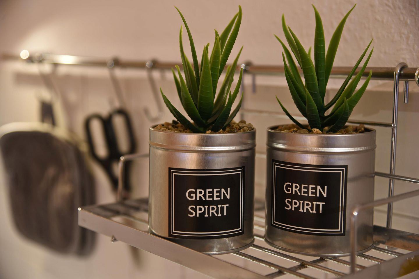 Die in den Wohnbereich integrierte offene Küchenzeile bietet einen Geschirrspüler, einen Kühlschrank mit Gefrierfach, einen Backofen und ein 4-Platten-Cerankochfeld. Notwendige Geräte wie Kaffeemaschine, Wasserkocher und Toaster sind ebenfalls vorhanden. Der Fußboden ist gefliest.