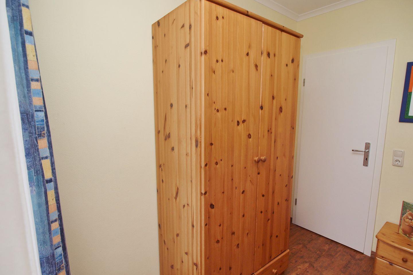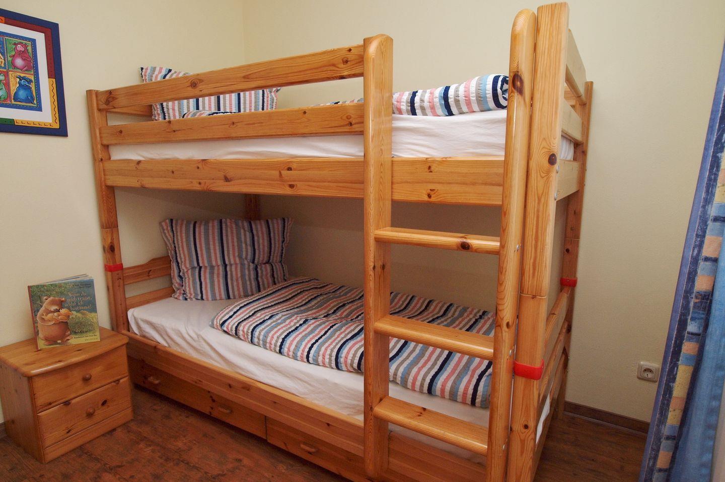 Im 1. Schlafzimmer befindet sich ein Doppelbett (2 x 90 x 200 cm), im 2. Schlafzimmer ein Etagenbett (2 x 90 x 200 cm) und jeweils ein Kleiderschrank für dein Gepäck. In beiden Schlafzimmern dienen Vorhänge zum Verdunkeln.