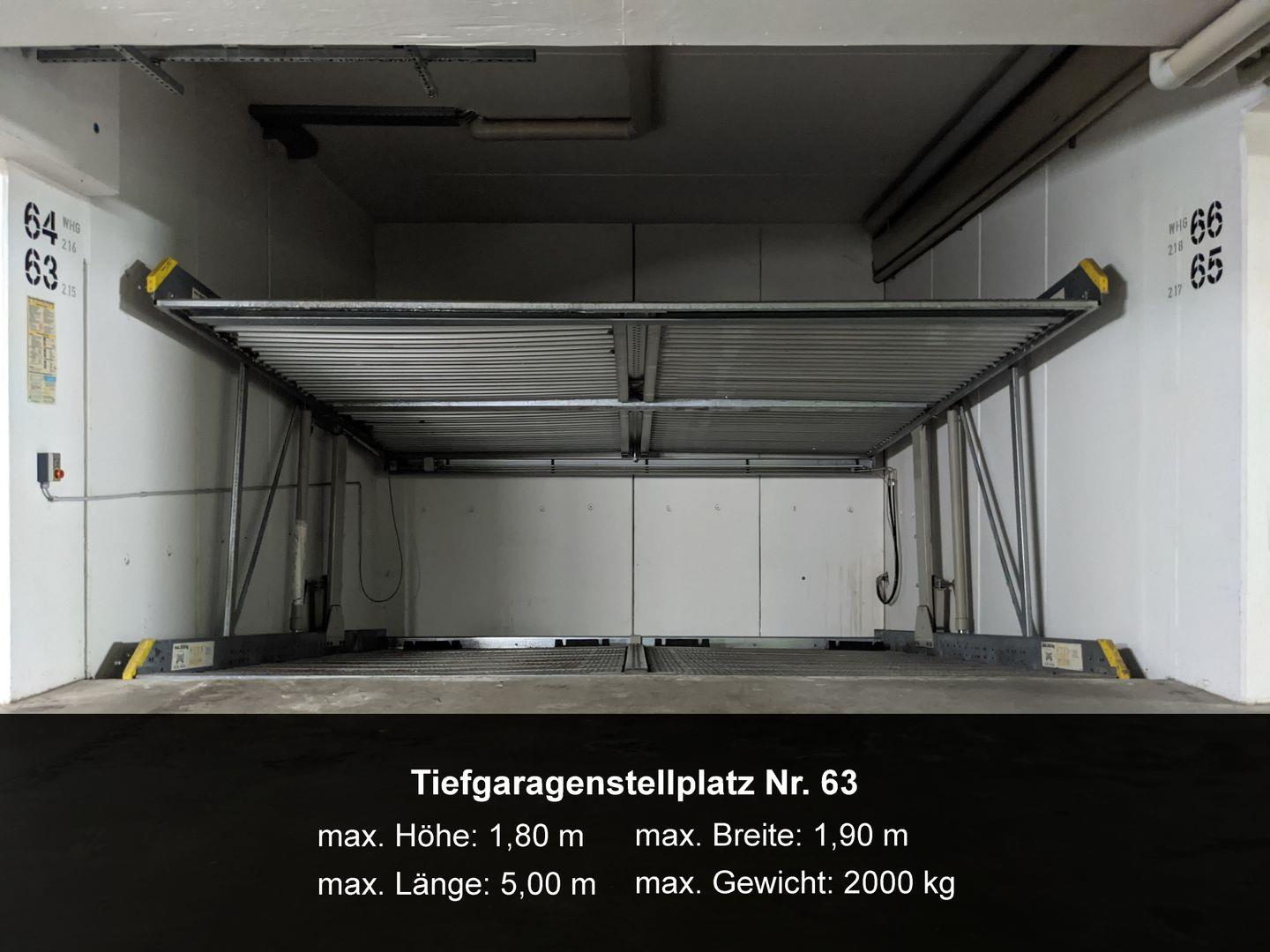 Zu der Wohnung gehört der Kfz-Stellplatz Nr. 63 in der Tiefgarage (max. Höhe 1,80 m, max. Gewicht 2.000 kg).