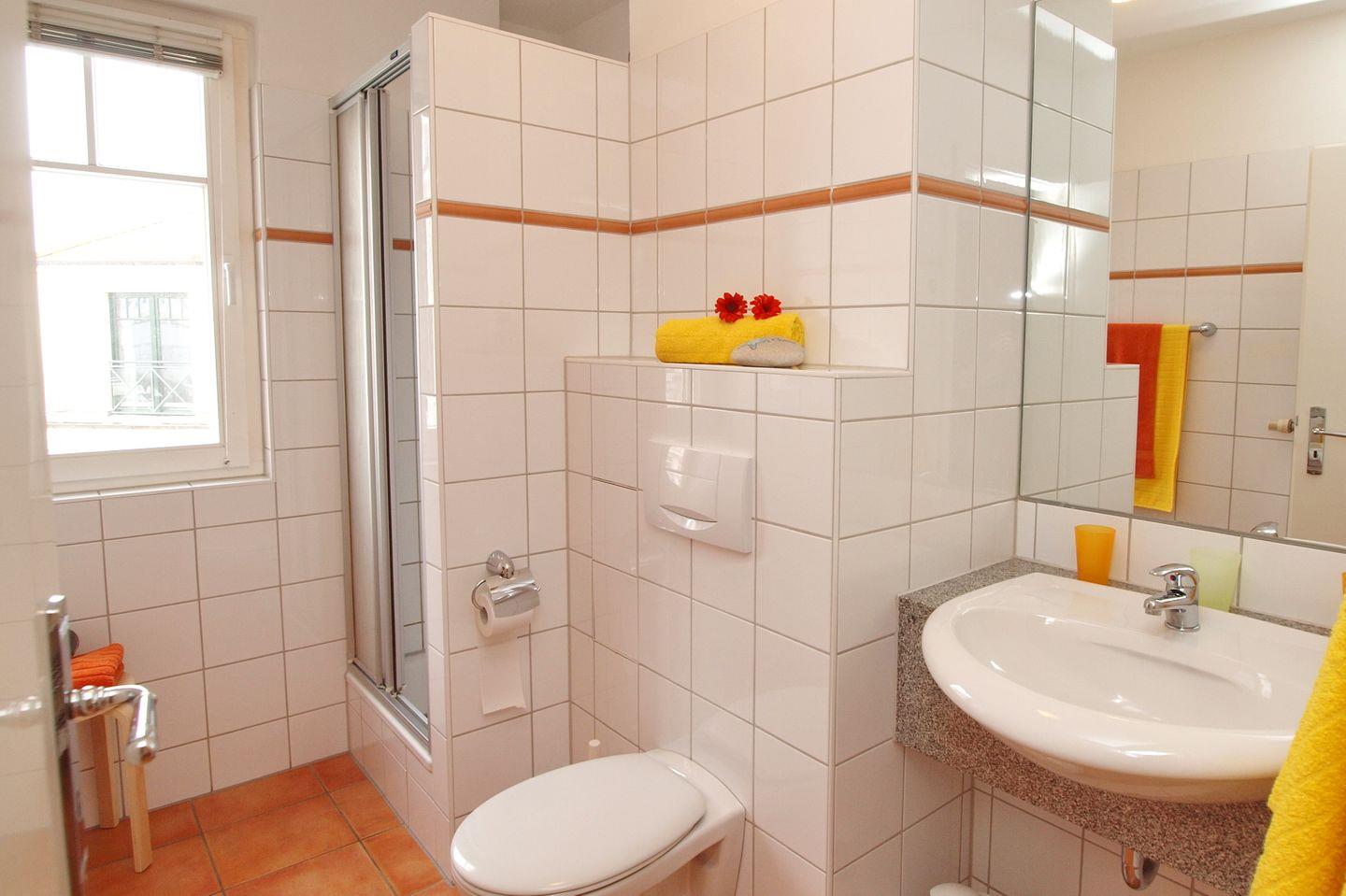 Die Ferienwohnung verfügt selbstverständlich auch über ein Duschbad mit WC und einen Föhn. In allen anderen Räumen wurde ein Vinylboden verlegt.