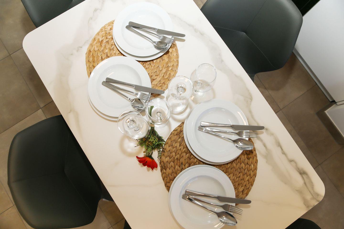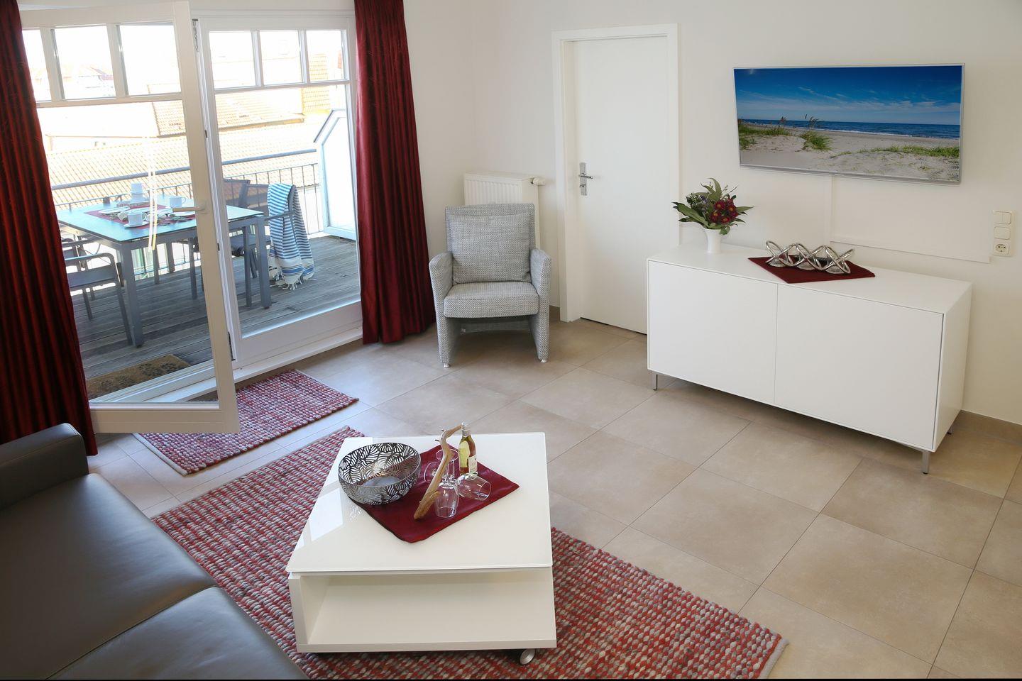 Zur Ausstattung gehören weiterhin ein Flachbild-TV, zwei Sessel und ein integrierter Esstisch, der bis zu 4 Personen Platz bietet.