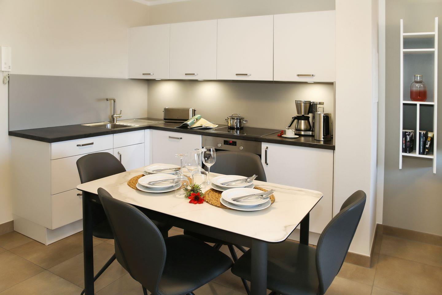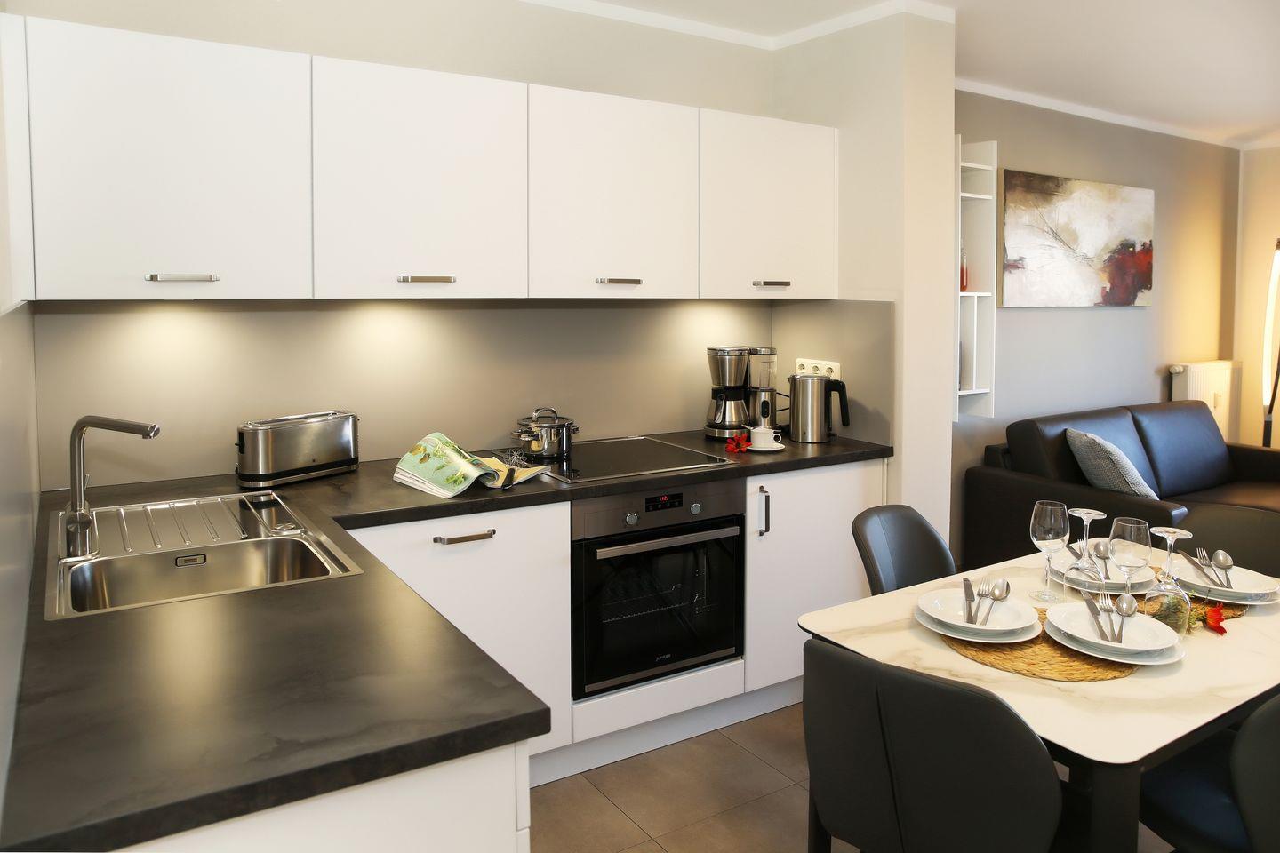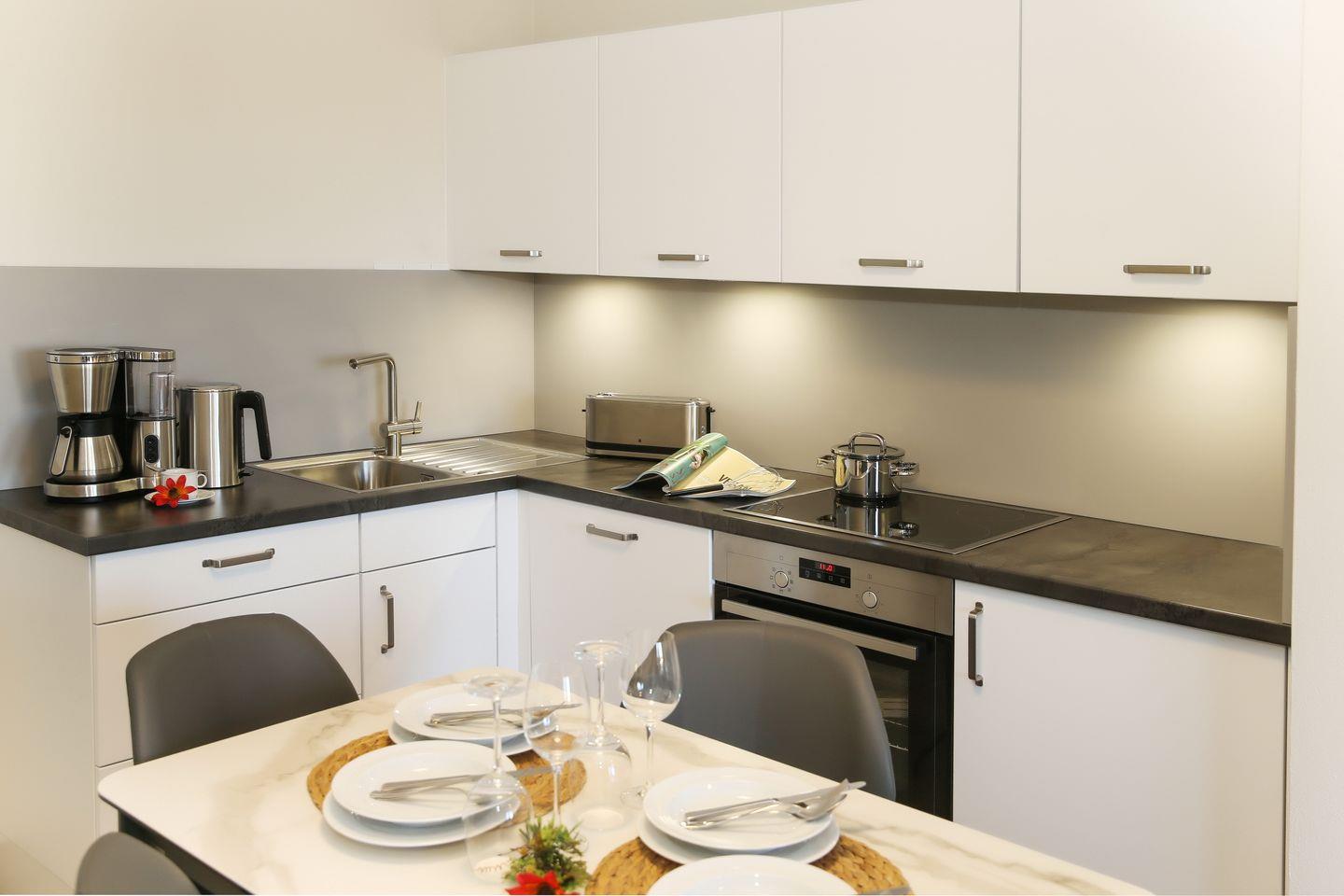 Im Küchenbereich befinden sich ein Backofen mit einem 4-Platten-Cerankochfeld, ein Geschirrspüler, eine Kaffeemaschine, ein Wasserkocher, ein Toaster und ein Kühlschrank mit Gefrierfach.