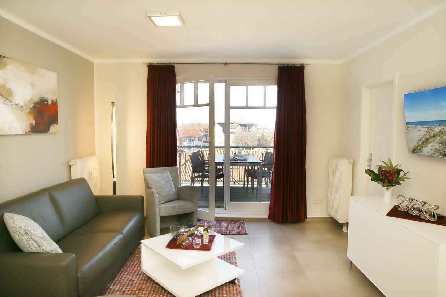 Unsere 2-Zimmer-Ferienwohnung Nr. 412 bietet dir den perfekten Rahmen für deine Erholung, Entspannung und Wohlbefinden. Dieses gemütlich eingerichtete Appartement (45 m²) in der 4. Etage verfügt über einen Westbalkon mit seitlichem Blick zur Ostsee.