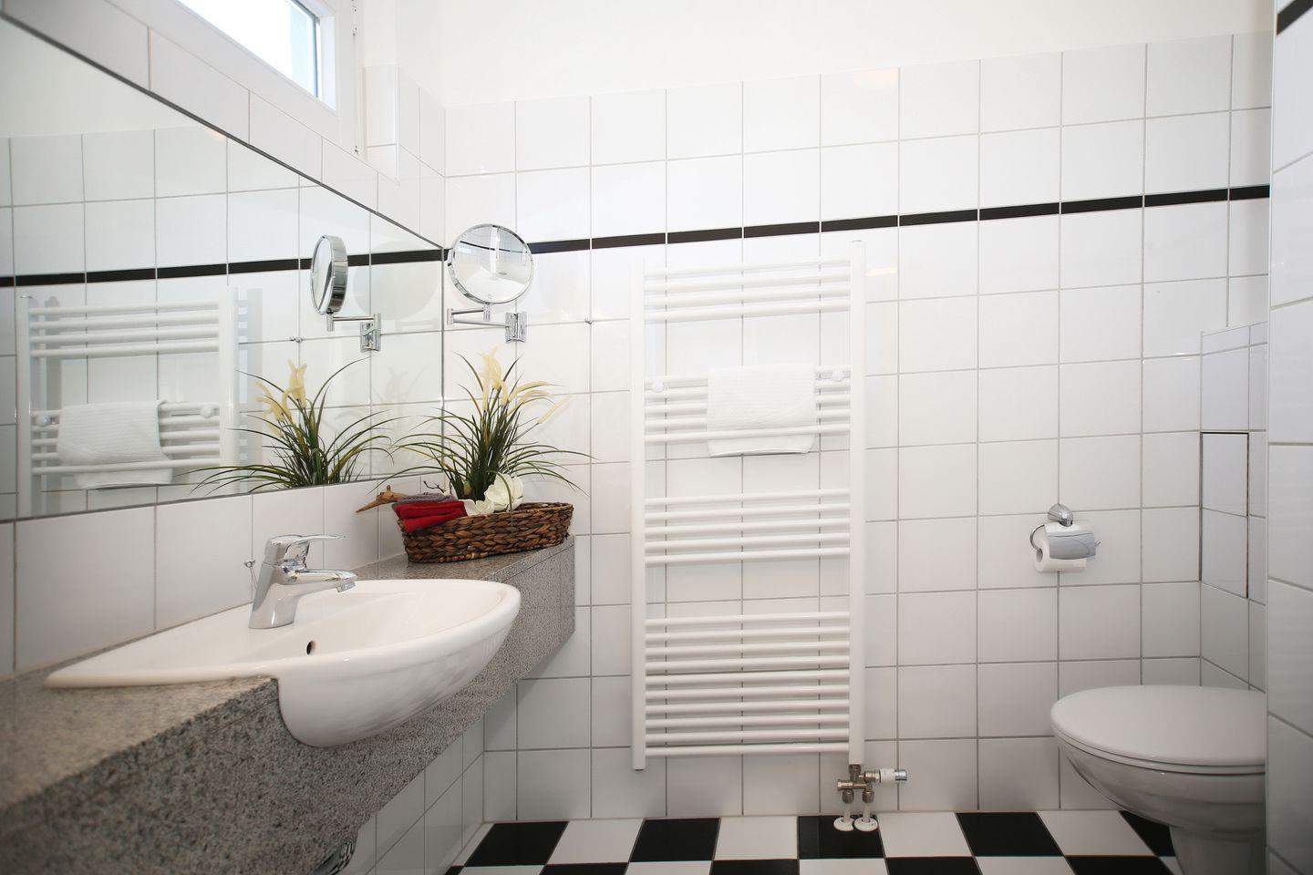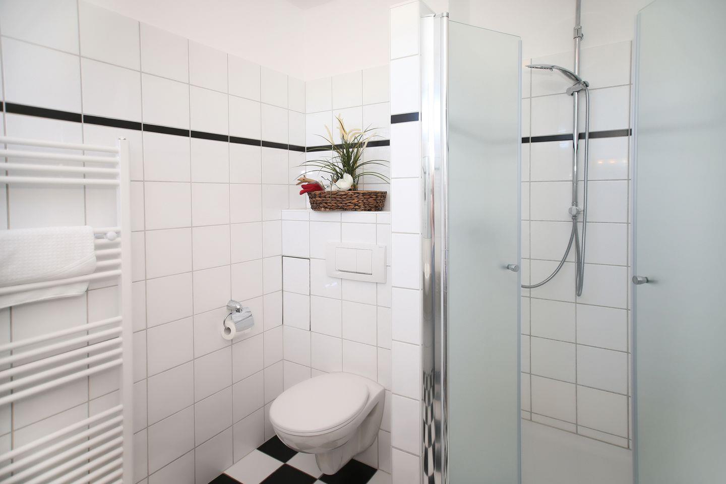 Ein Duschbad/WC ist ebenfalls vorhanden. Ein Föhn und ein Kosmetikspiegel komplettieren die Ausstattung des Badezimmers.