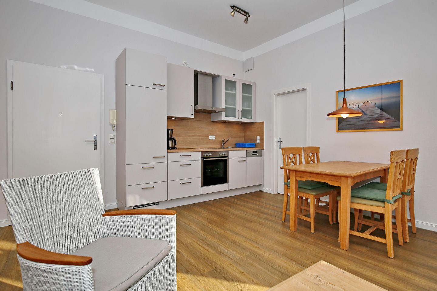 Der Esstisch und die Küchenzeile sind im Wohnraum integriert. Die Küche wartet mit einem Geschirrspüler, Herd mit Backofen, einem 4-Zonen-Cerankochfeld sowie einem Kühlschrank mit Gefrierfach auf. Selbstverständlich stehen Kaffeemaschine, Wasserkocher und Toaster ebenfalls bereit.