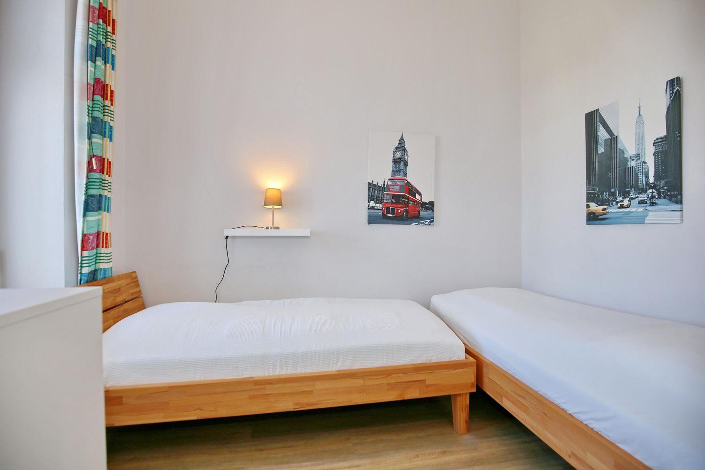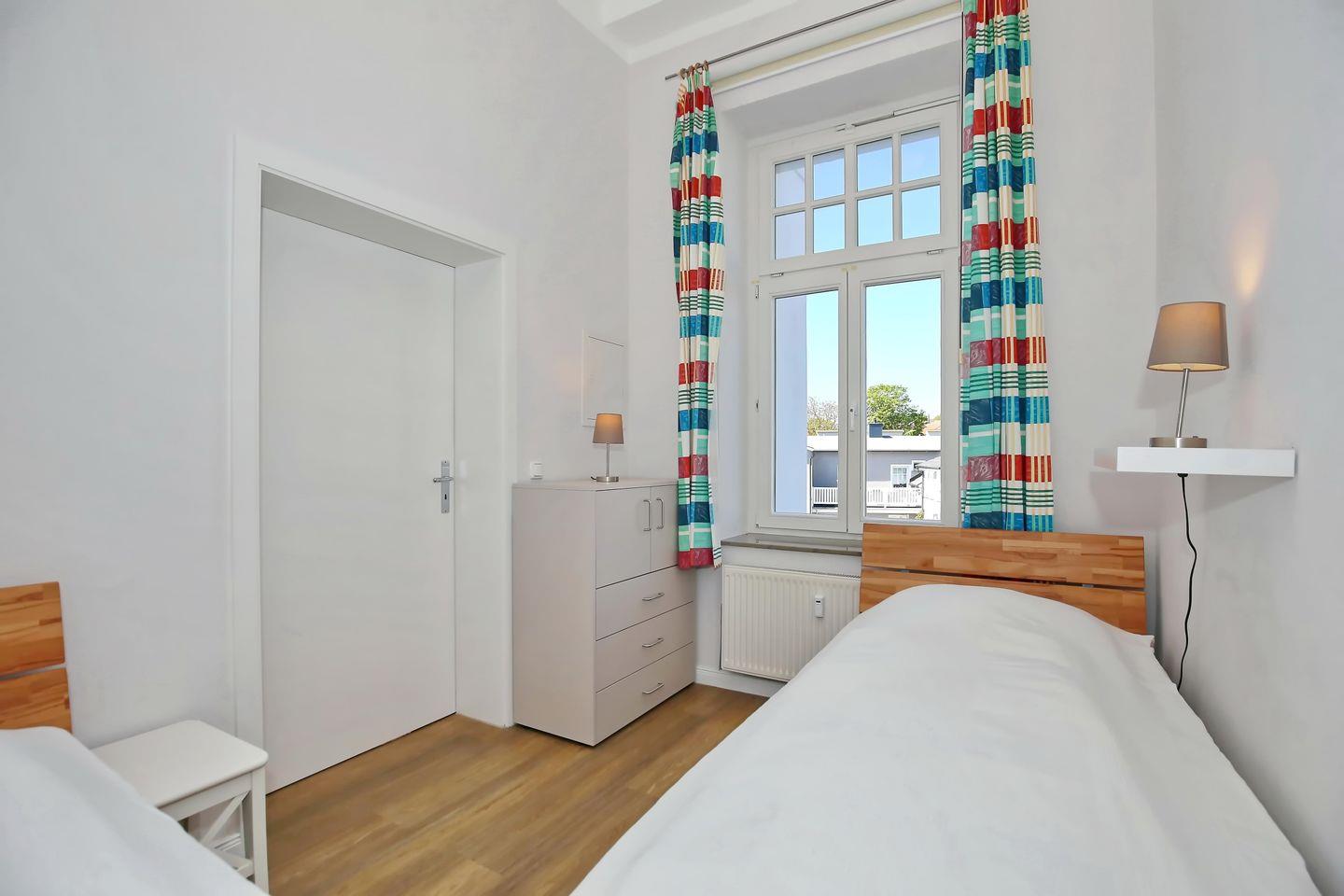 Im ersten Schlafzimmer der Ferienwohnung steht dir ein großes Doppelbett (2 x 90 x 200 cm) zur Verfügung. Das zweite Schlafzimmer ist mit zwei Einzelbetten (90 x 200 cm) ausgestattet. Deine Urlaubsgarderobe und Reiseutensilien bringst du im geräumigen Kleiderschrank unter. An den Fenstern dienen Vorhänge als Verdunklungsmöglichkeit.