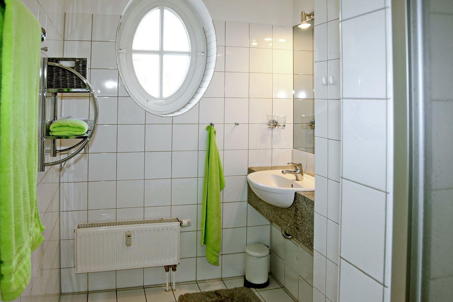 Die Ferienwohnung verfügt selbstverständlich auch über ein Duschbad/WC mit Fenster zur Seeseite. Als Bodenbelag findest du im Wohn- und Nassbereich Fliesen vor. Im Wohn- und Schlafbereich liegen Vinyl-Planken.