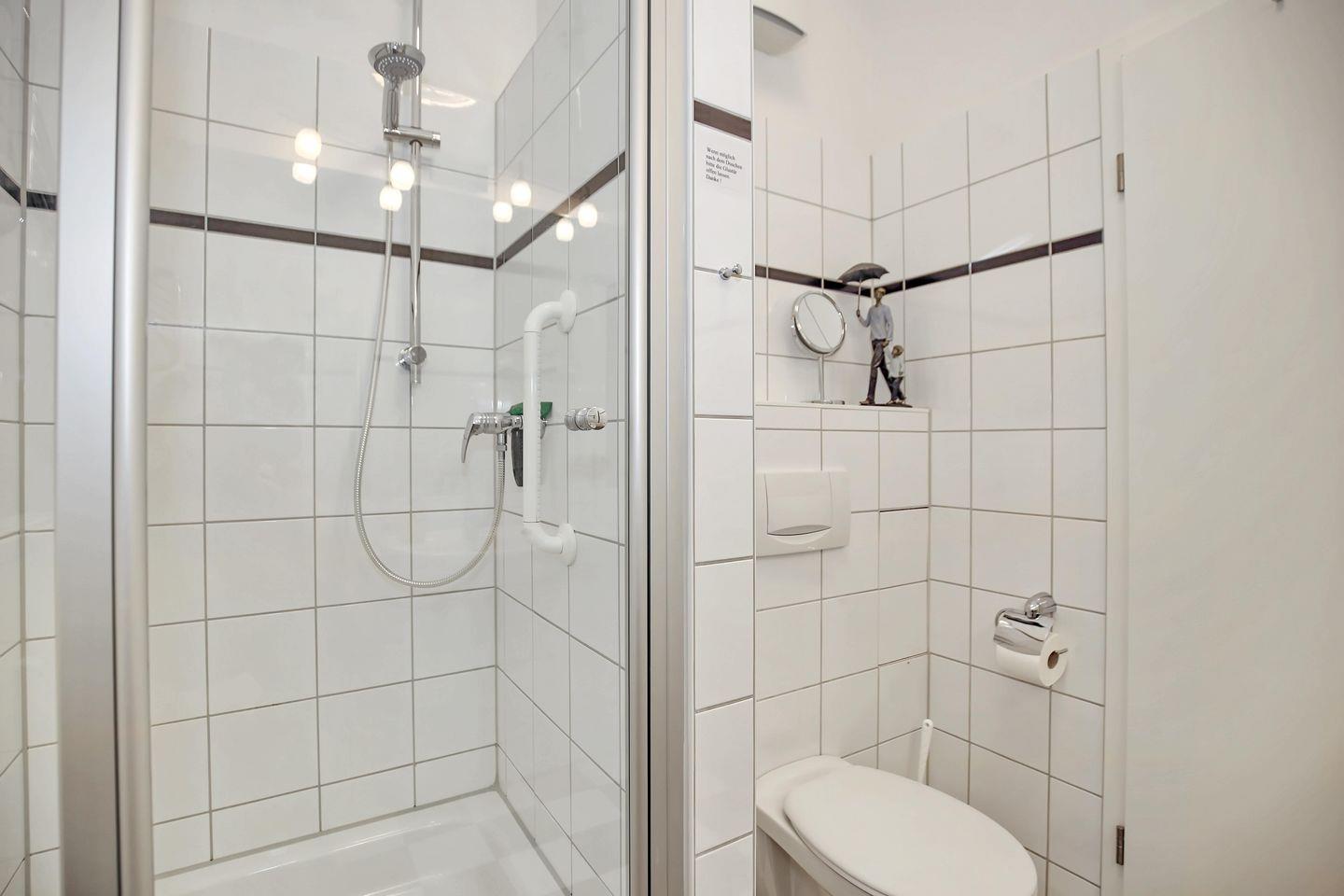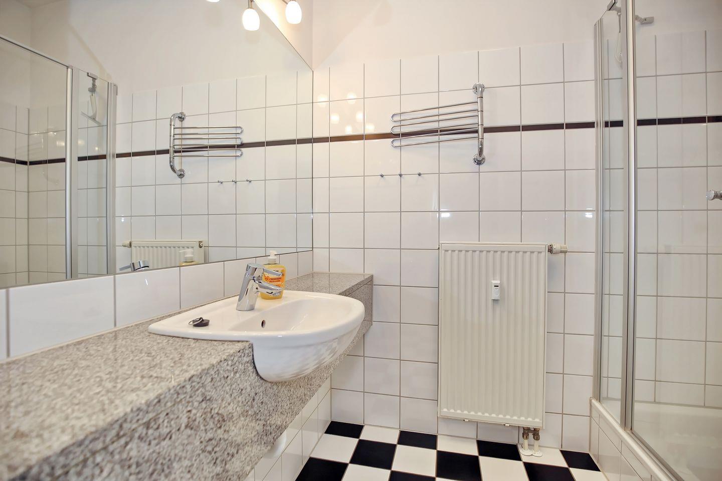 Die Ferienwohnung verfügt über ein Duschbad mit WC. Der großzügige Waschtisch bietet genügend Platz für deine Waschutensilien. Ein Dusch-Hocker komplettiert die Ausstattung des Bades. Das Bad, der Flur und der Küchenbereich sind gefliest. Im Wohnbereich ist Vinyl und im Schlafzimmer ist Teppichboden verlegt. In dieser Nichtraucherwohnung sind Haustiere nicht erlaubt.