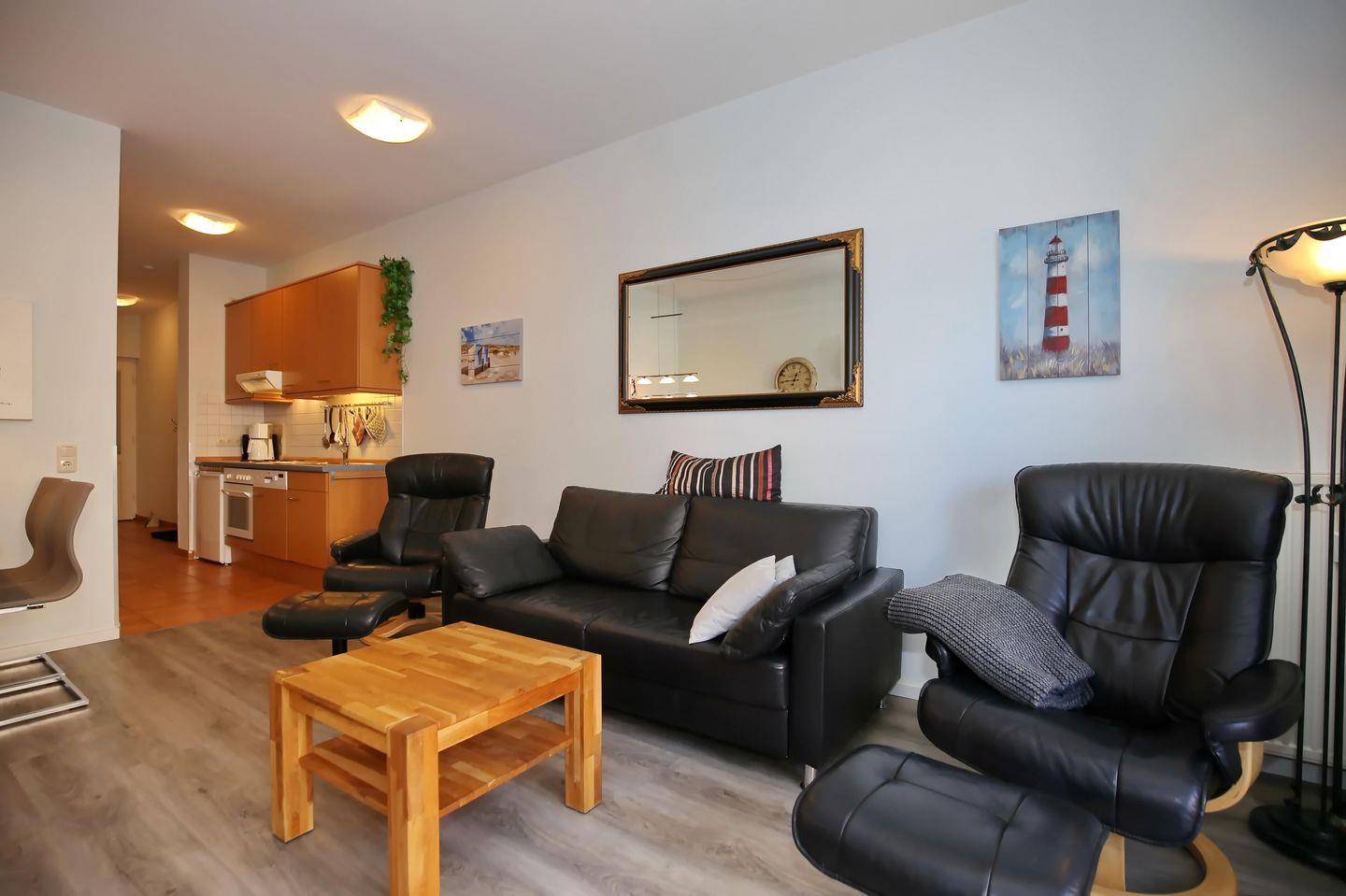 Der Wohnbereich ist für dich mit einer bequemen Couch und 2 passenden Fernsehsesseln, einem Flachbild-TV sowie einem Blu-Ray-Player eingerichtet. Erlebe hier gesellige Abendstunden. Während deines Urlaubs kannst du das kostenlose WLAN (ohne Gewähr) der Ferienwohnung nutzen. Der im Wohnbereich integrierte Essbereich bietet dir genügend Platz für gemeinsame Mahlzeiten.