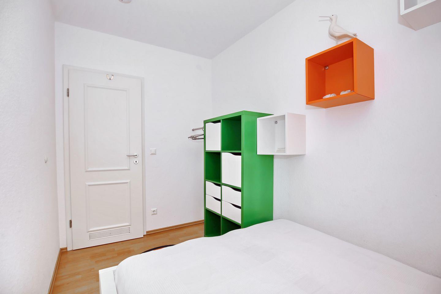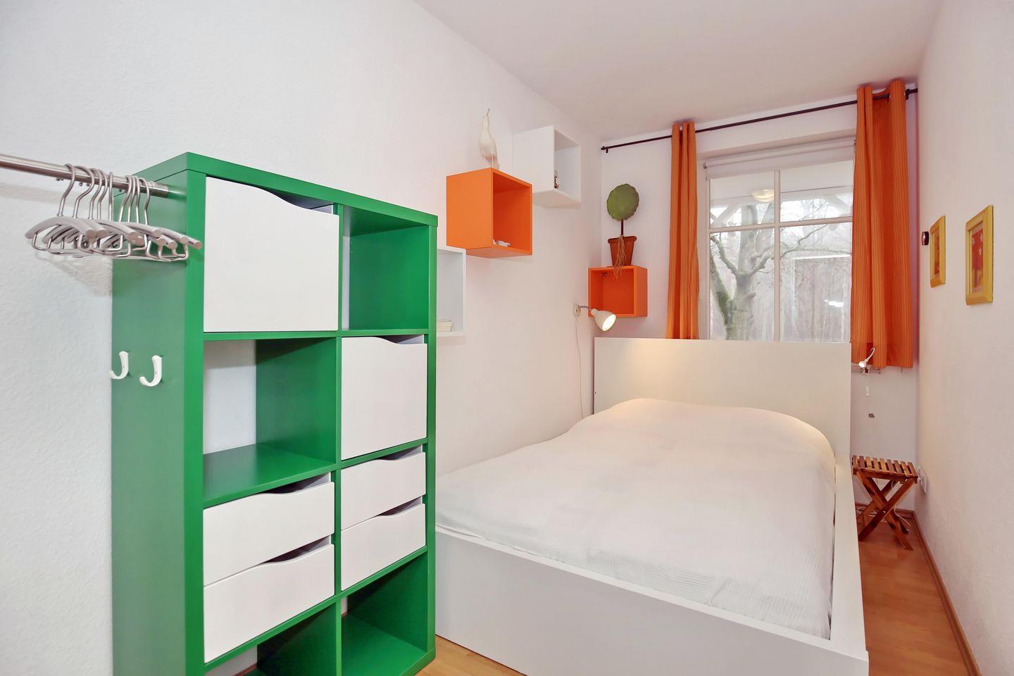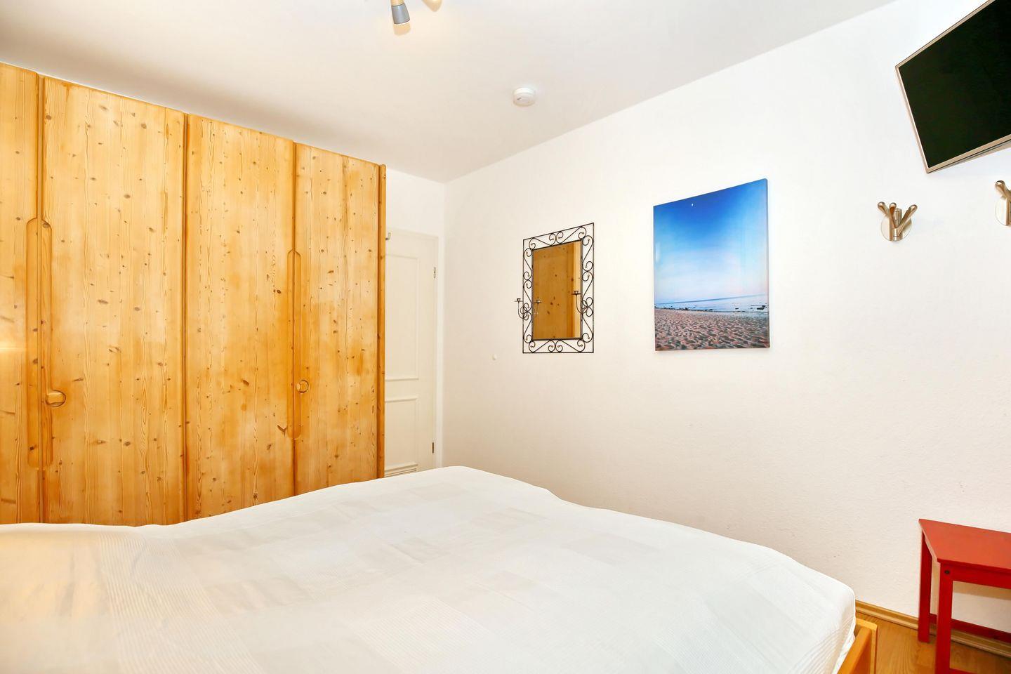 Erholen kannst du dich in einem der beiden Schlafzimmer der Ferienwohnung. Im ersten Schlafzimmer steht ein Doppelbett (2 x 90 cm x 200 cm ) mit offenen Fußende und im zweiten ebenfalls ein Doppelbett (140 cm x 200 cm) zur Verfügung. Deine Urlaubsgarderobe bringst du in den Kleiderschränken unter. Zur Verdunklung gibt es Vorhänge und ein Plissee/Rollo.