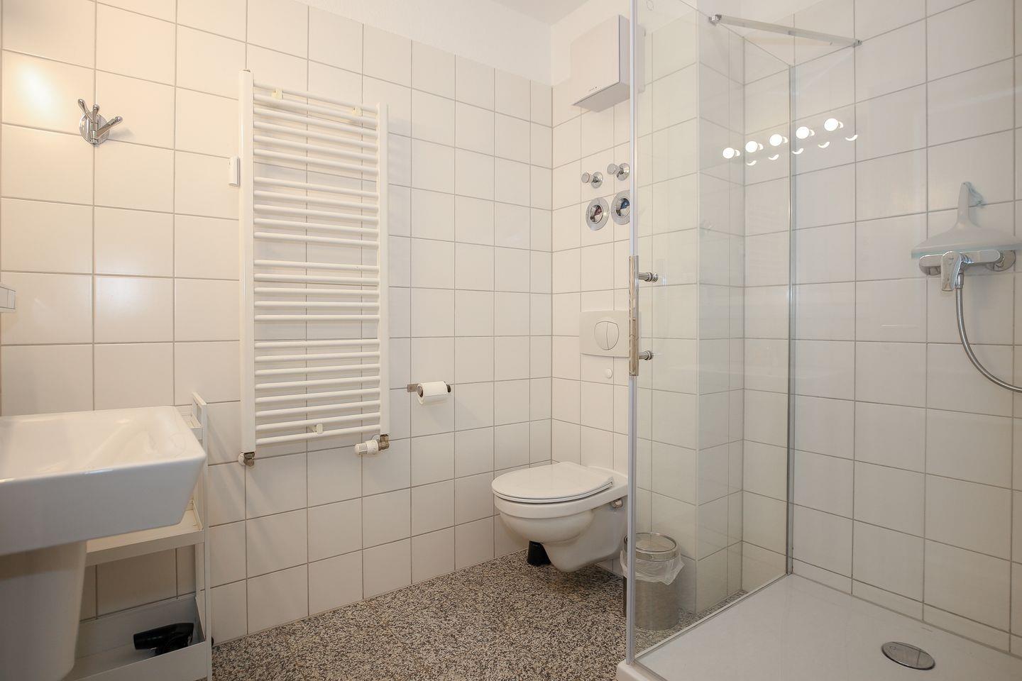 Im innenliegenden Badezimmer findest du eine Dusche, ein WC, ein Waschbecken und einen Spiegel vor. Im Bad und im Küchenbereich wurde gefliest. Die restliche Wohnung verfügt über einen Laminatboden.