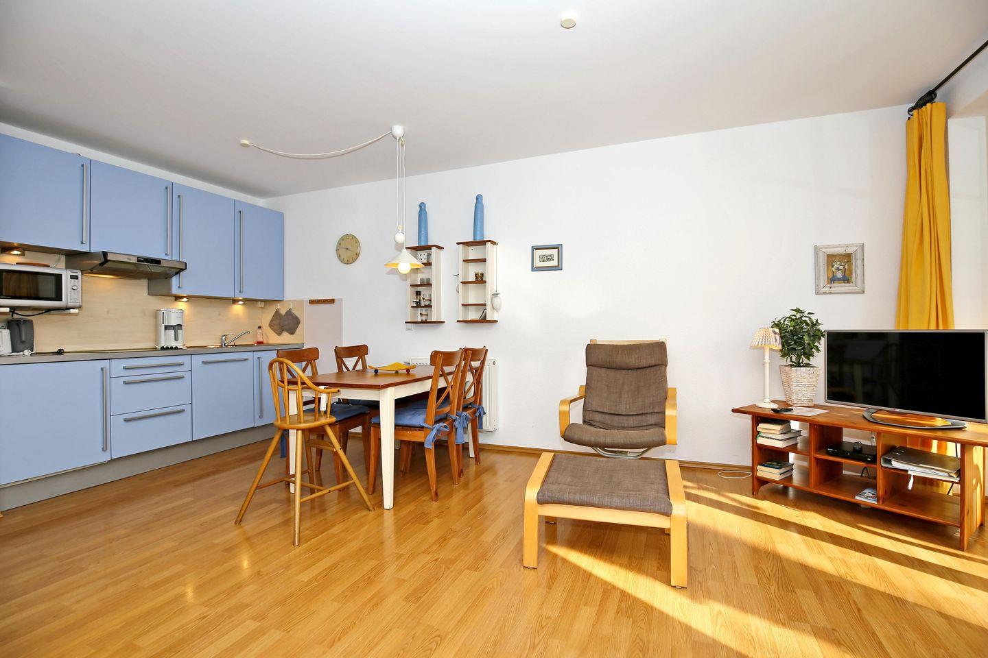 Im Wohnraum integriert ist auch die gut sortierte Küchenzeile. Hier erwarten dich ein 4-Platten-Cerankochfeld, ein Geschirrspüler, eine Kombimikrowelle mit Backfunktion und einen Kühlschrank mit Gefrierfach. Selbstverständlich gibt es auch eine Kaffeemaschine, einen Wasserkocher sowie einen Toaster. Am angrenzenden Esstisch kannst du bequem zu viert die gemeinsamen Mahlzeiten genießen. Für die kleinen Gäste steht ein Kinderhochstuhl zur Verfügung.
