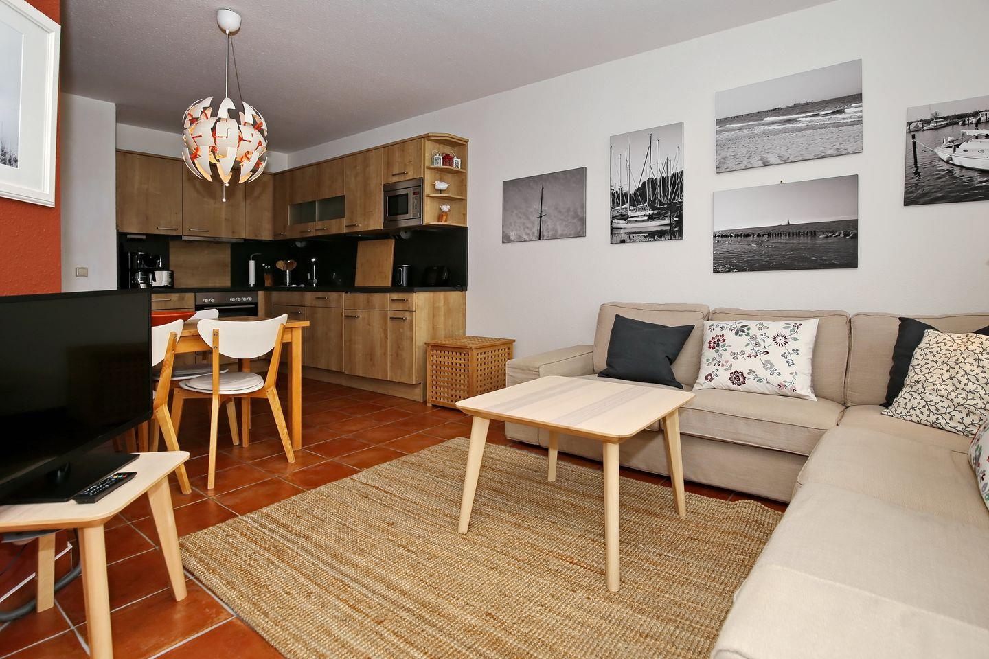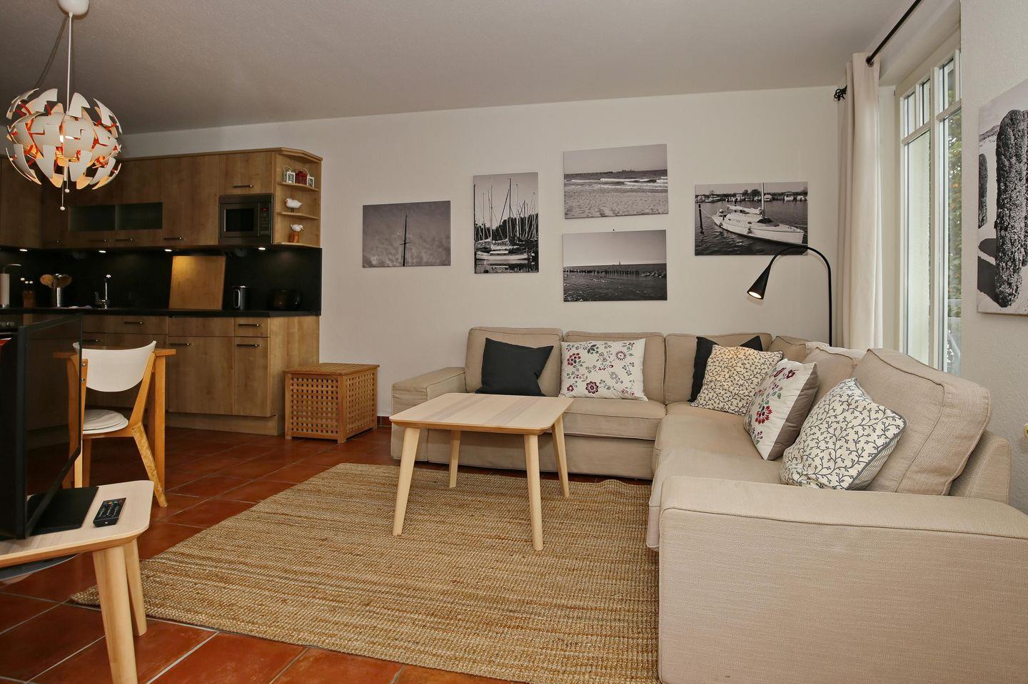 Im Wohnbereich steht dir ein komfortables Ecksofa zur Verfügung. Auf dem vorhandenen Flachbild-TV kannst du deine Lieblingsprogramme schauen. Für die musikalische Unterhaltung findest du eine Stereoanlage mit Bluetooth vor.