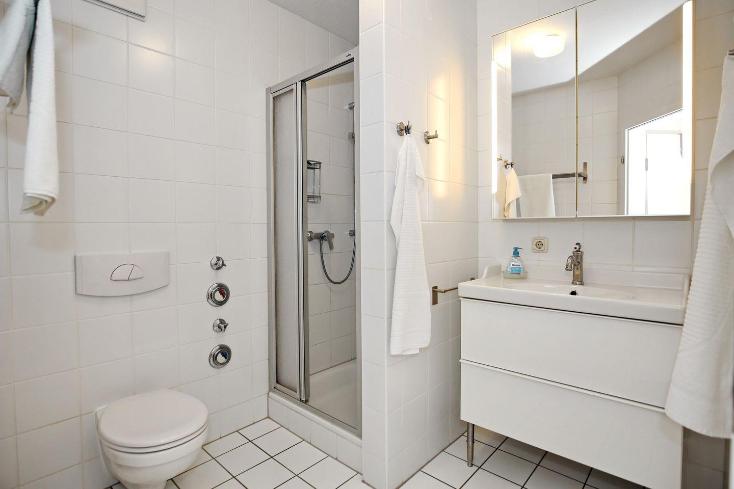 In der Wohnung befindet sich außerdem ein geräumiges Duschbad. Als Bodenbelag wurden Fliesen gewählt. In den Schlafzimmern der Ferienwohnung findest du einen PVC-Belag vor.