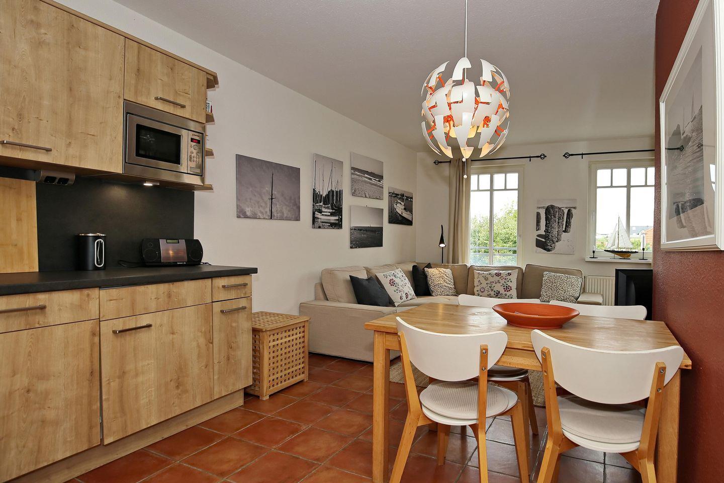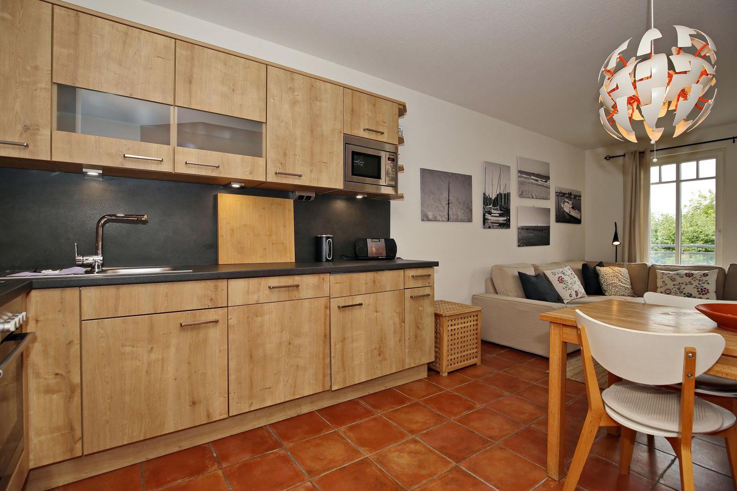 Ebenfalls im Raum integriert ist die Küchenzeile. Diese bietet dir ein Cerankochfeld, einen Backofen, einen Geschirrspüler, einen Kühlschrank mit Gefrierfach und eine Mikrowelle. Selbstverständlich findest du hier auch eine Kaffeemaschine, einen Wasserkocher und einen Toaster vor. Des Weiteren findest du in der Küche noch eine Tapmaschine und eine Nespressomaschine vor. Im angrenzenden Essbereich kannst du deine gemeinsamen Mahlzeiten zu viert genießen.