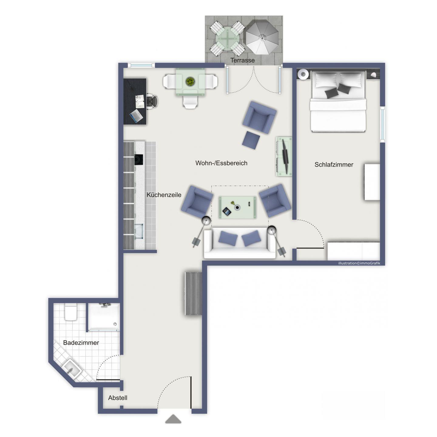 Die Wohnung Nr. 6, die über eine sehr schöne und ruhige Ost-Terrasse mit einer gepflegten Rasenfläche umgeben von Hecken verfügt, ist ein komfortables, harmonisch abgestimmtes und voll ausgestattetes 2-Zimmer-Appartement.