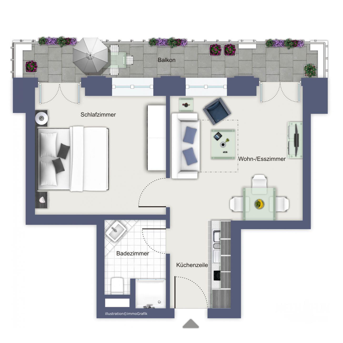 Ein tiefer gelegter Duscheinstieg befindet sich im komfortabel eingerichteten Duschbad mit WC und Föhn, welches gefliest ist. In allen anderen Räumen wurde ein Vinylboden verlegt.