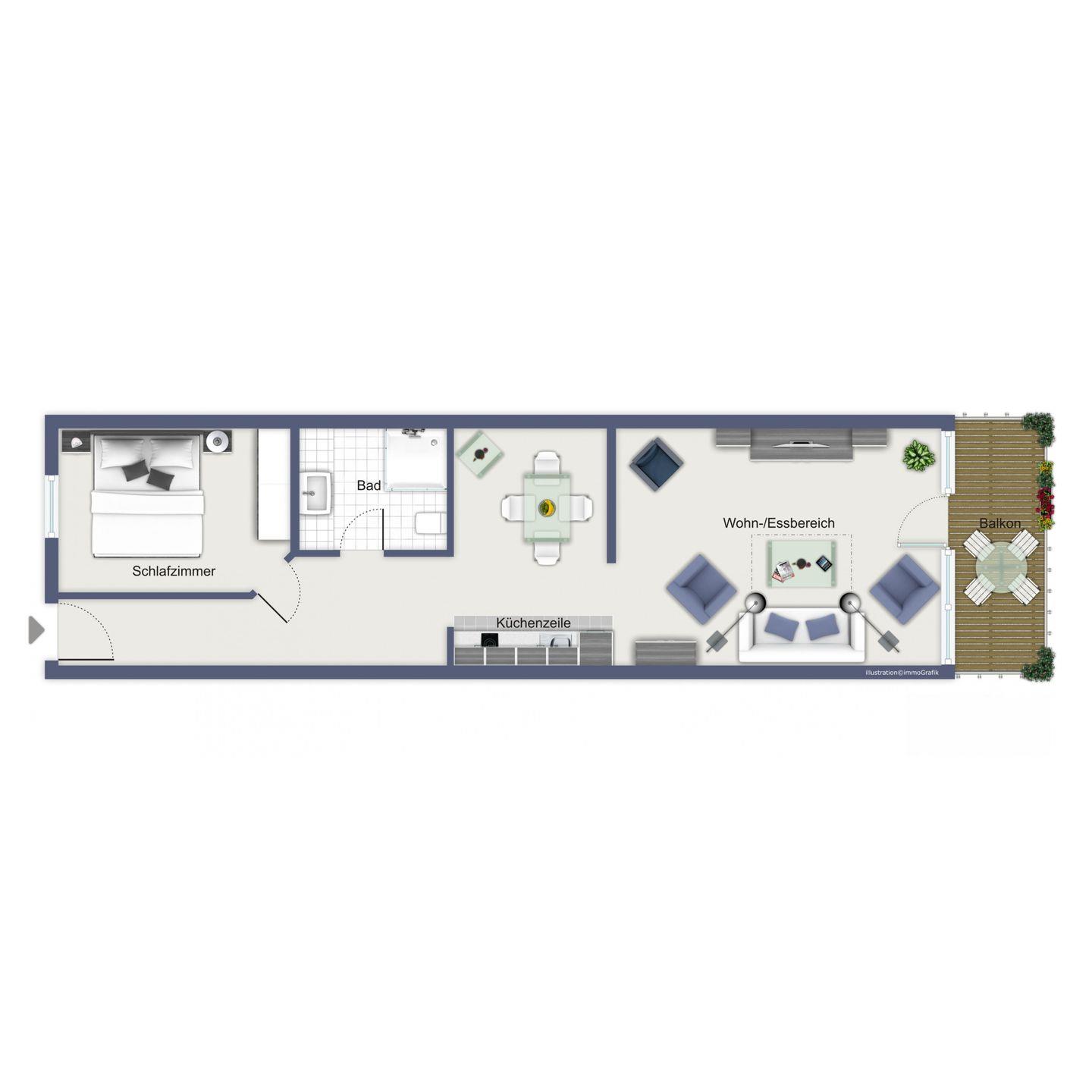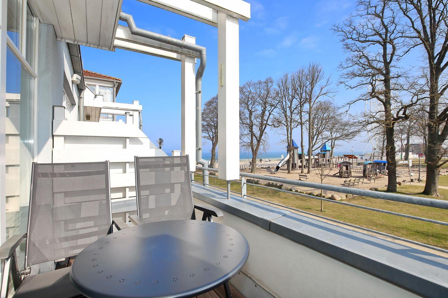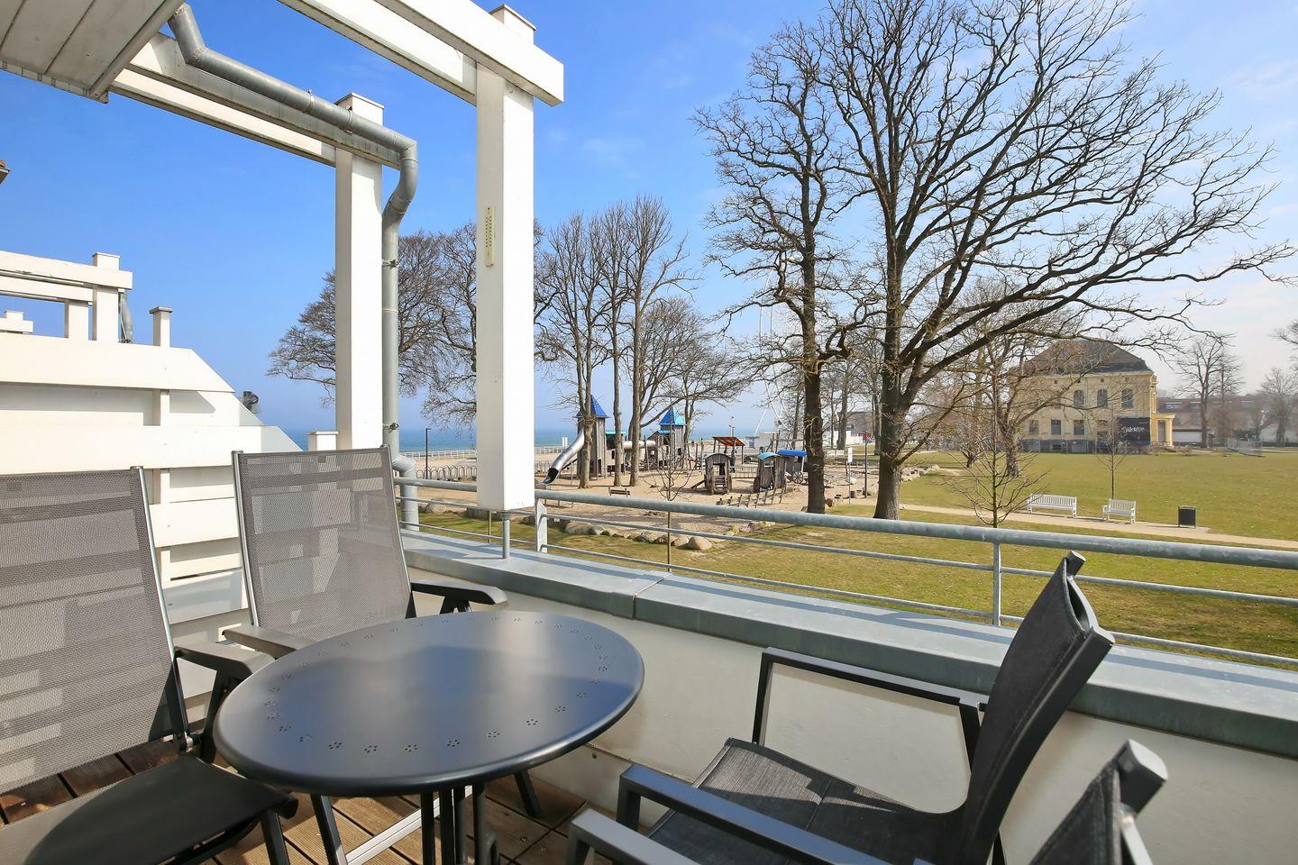 Die Ferienwohnung 105 im Haus Meeresblick ist eine 2-Zimmer-Wohnung im 1. OG mit einer Größe von etwa 54 m². Vom Balkon, haben Sie einen Teilseeblick auf die Ostsee.