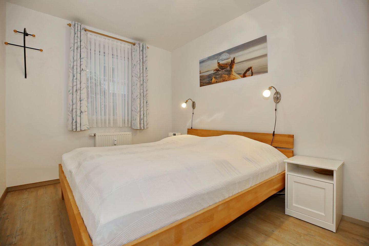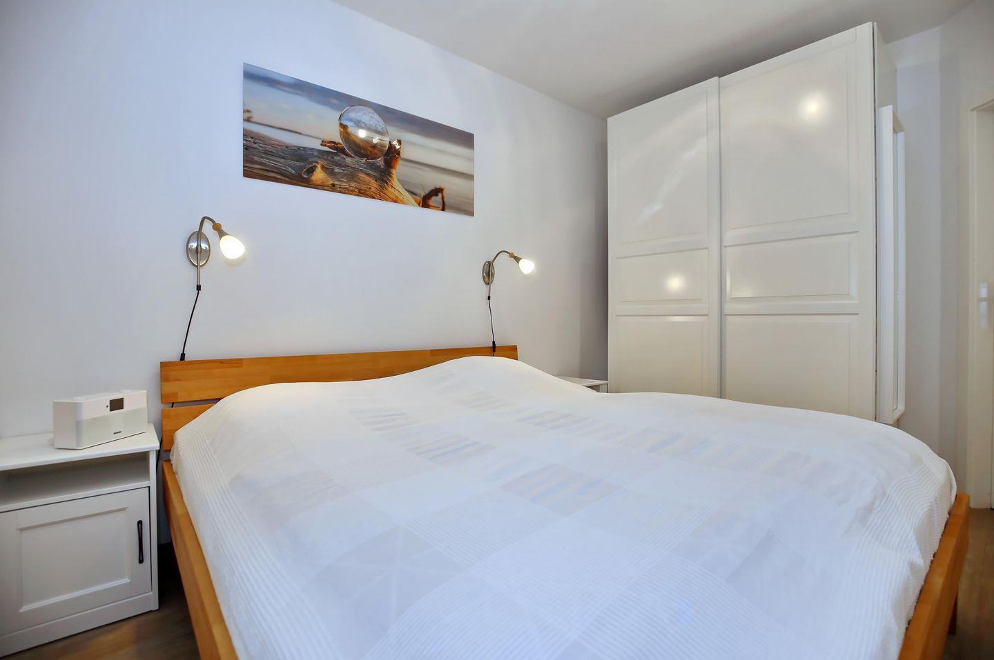 Im Schlafzimmer dieser Ferienwohnung lädt dich ein Doppelbett (2 x 90 x 200 cm) zum erholsamen Schlaf ein. Für gemütliches Licht und perfekte Lesestunden sorgen die gut platzierten Leselampen am Bett. Ein großer Schiebekleiderschrank bietet viel Stauraum. Das Schlafsofa (140 x 200 cm) im Wohnbereich wird mit wenigen Handgriffen zu einem Schlafplatz für weitere 2 Personen. Vorhänge dienen dir in den Schlafbereichen als Sichtschutz und zum Verdunkeln (das Schlafzimmerfenster geht zum Atrium raus).