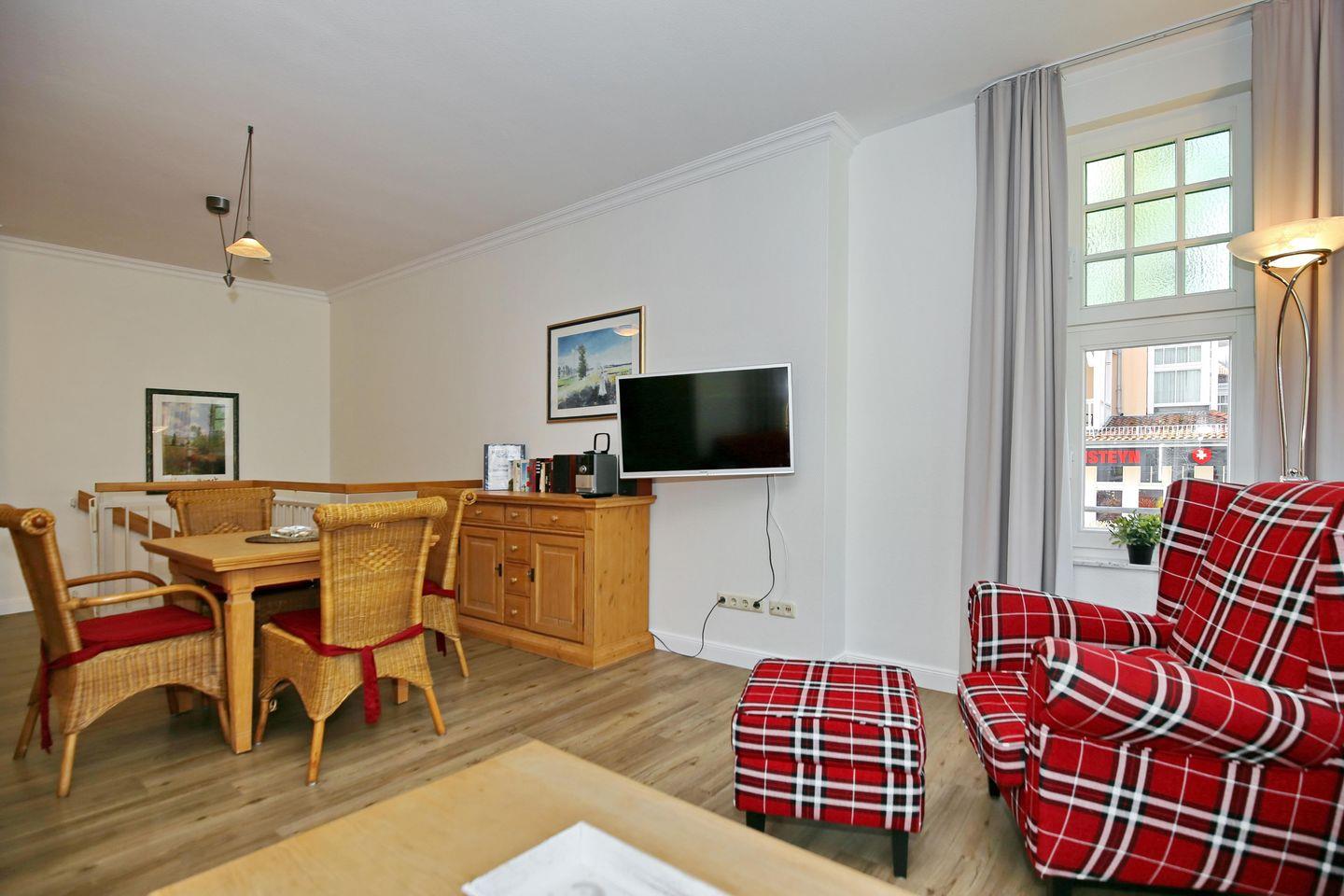 Das Wohnzimmer liegt in Hochparterre und ist mit einer Doppelschlafcouch (160x200 cm) und einem Flachbild-TV ausgestattet.
