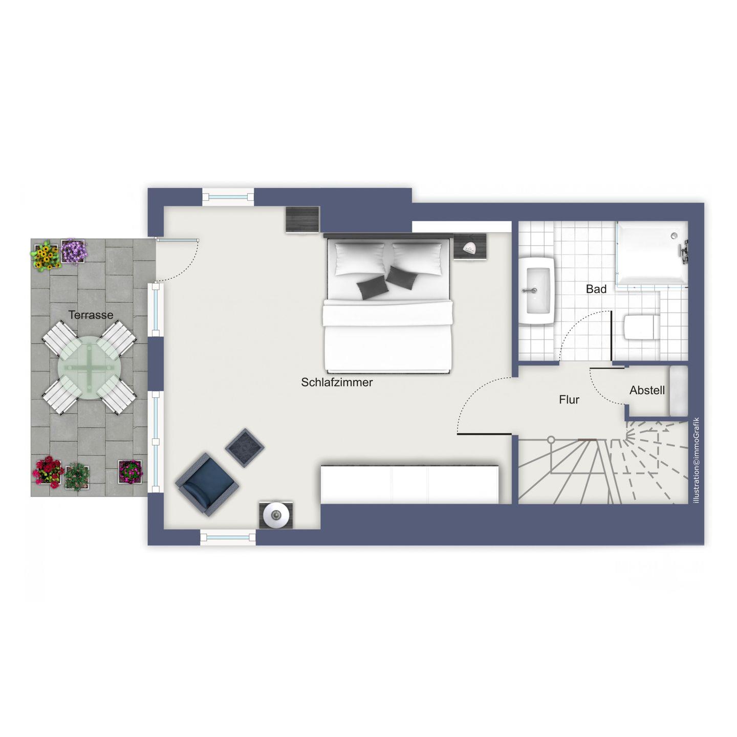 Das Schlafzimmer befindet sich im Untergeschoss und verfügt über ein großes Doppelbett (2x 90 x 200 cm) und einen großen Kleiderschrank sowie eine kleine Sitzecke. Von hier aus gelangst du auf die Terrasse.