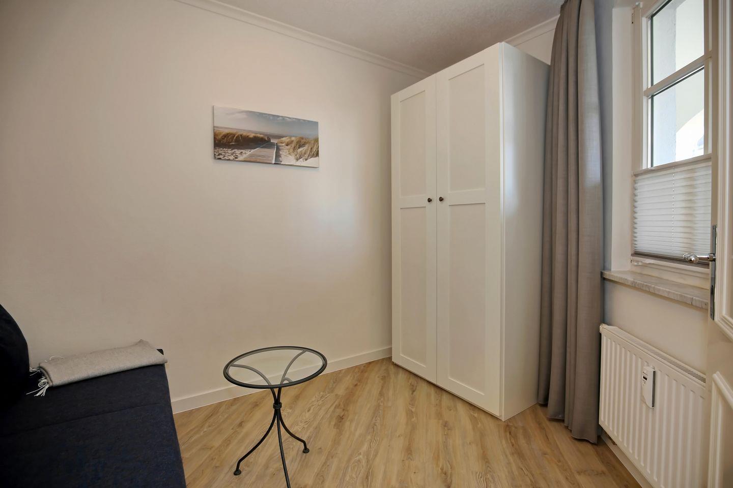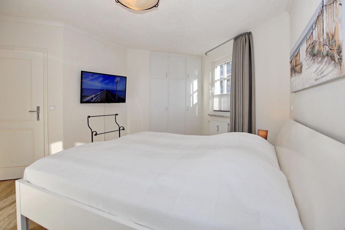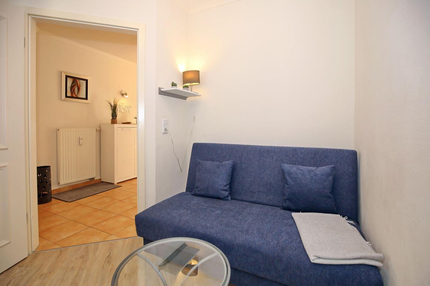 Das erste Schlafzimmer der Ferienwohnung ist für dich mit einem Doppelbett (2 x 90 x 200 cm) sowie einen großen Einbauschrank, wo du ein Bügelbrett und Bügeleisen findest, einen Kleiderschrank und einem TV eingerichtet. Der Kleiderschrank bietet dir viel Stauraum für dein Urlaubsgepäck. Das zweite Schlafzimmer ist mit einer Schlafcouch (140 x 200 cm) ausgestattet. Auch hier bietet dir ein Kleiderschrank Stauraum. Die Schlafcouch (180 x 200 cm) im Wohnbereich wird mit wenigen Handgriffen zu einem Schlafplatz für 2 weitere Personen. In beiden Schlafzimmern sowie im Wohnbereich sind Gardinen, Vorhänge und Plissees als Sichtschutz oder zum Verdunkeln angebracht.