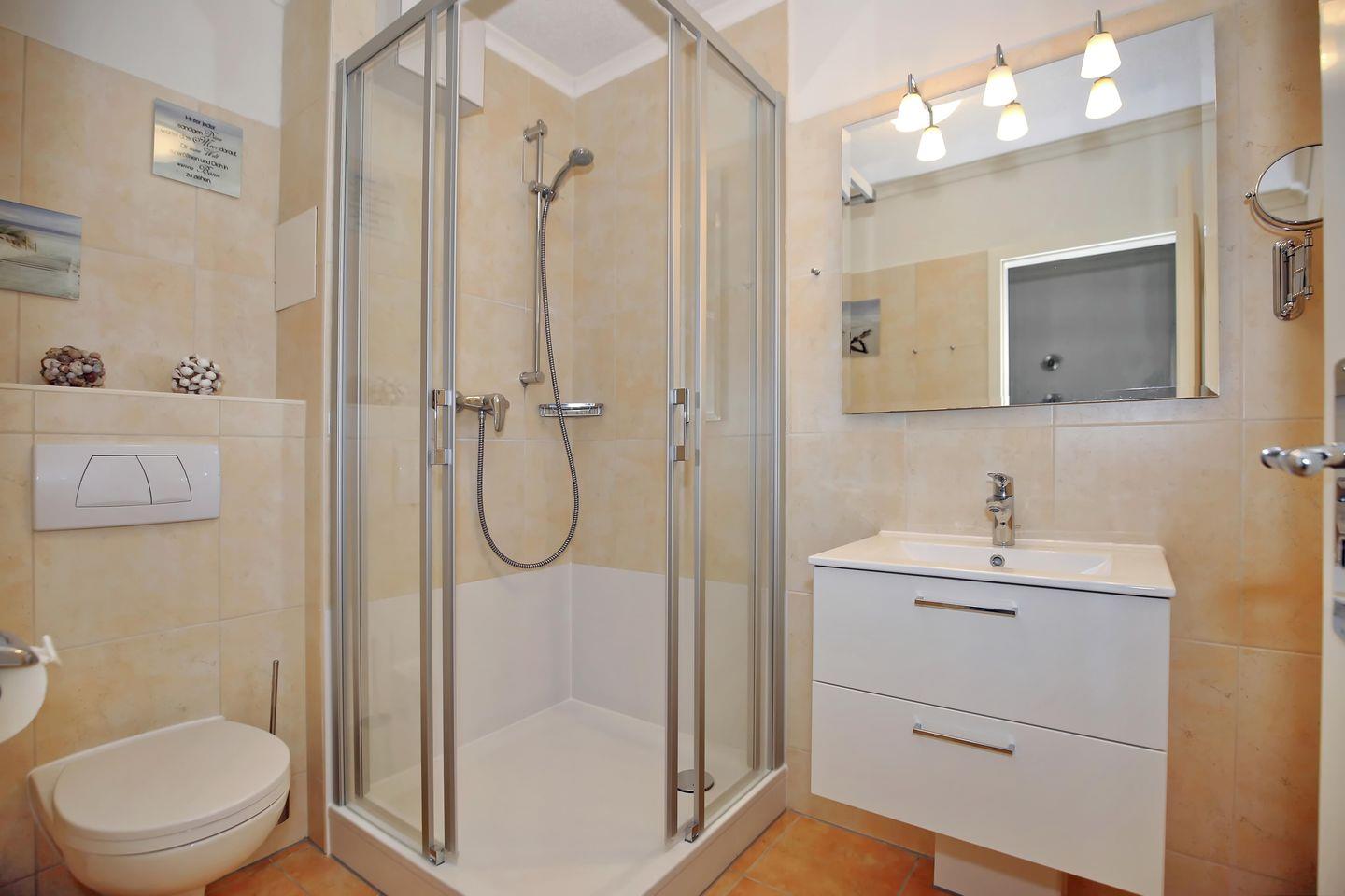 Im Duschbad findest du im Waschtisch Ablagemöglichkeiten für deine Waschutensilien. Der beleuchtete Spiegel verleiht dem, Bad eine helle und freundliche Atmosphäre. In der Wohnung ist der Boden gefliest. Ein Teppich vor der Couch sowie verlegter Designbelag in den Schlafzimmern verleihen den Wohn- und Schlafbereichen Behaglichkeit. Es handelt sich um eine Nichtraucherwohnung.