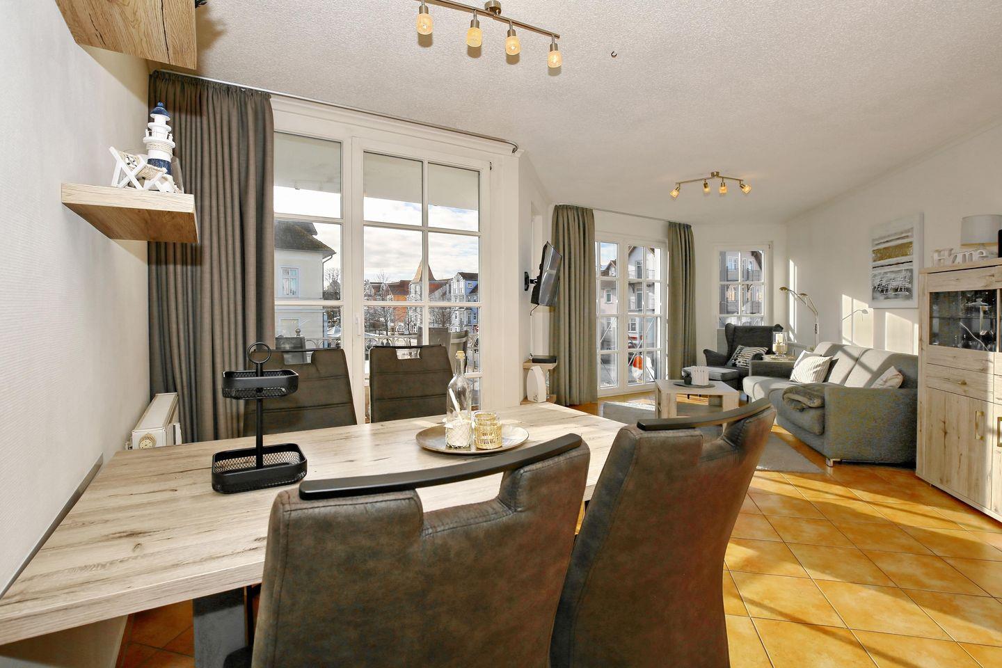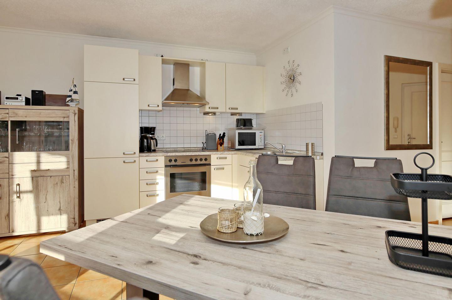 Im Wohnbereich der Ferienwohnung garantieren dir ein bequemes Sofa, ein Sessel sowie ein Flachbild-TV, ein Blu-ray-Player und eine Stereoanlage entspannte Abendstunden. Der WLAN-Zugang steht dir kostenlos zur Verfügung. Der Essbereich ist das Verbindungsstück zwischen dem Wohnbereich und der Küche. Hier hast du genügend Platz für deine gemeinsamen Mahlzeiten.