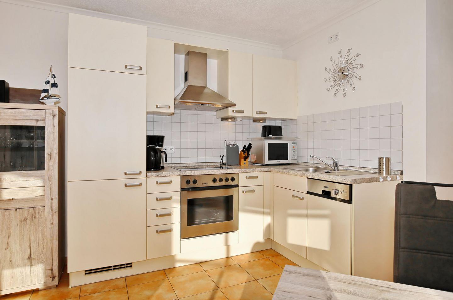Die moderne Küchenzeile ist für dich mit einem Kühlschrank mit Gefrierfach, einem 4-Platten-Cerankochfeld mit Backofen, einer Mikrowelle sowie einem Geschirrspüler sehr gut ausgestattet. Ein Wasserkocher, ein Toaster und eine Kaffeemaschine vervollständigen die Kücheneinrichtung.
