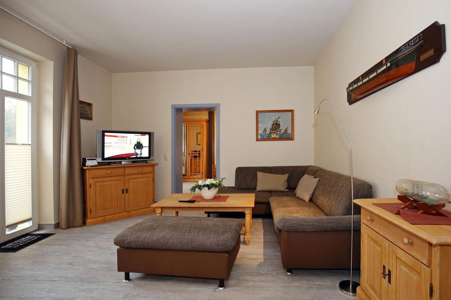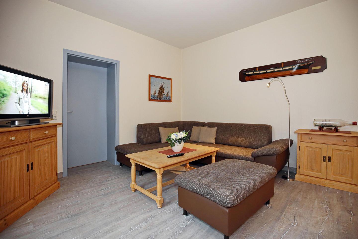 Das Wohnzimmer ist mit einer gemütlichen Schlafcouch (150 x 200 cm) und einem Flachbild-TV ausgestattet. Im Wohnbereich befindet sich der Zugang zum Südbalkon.