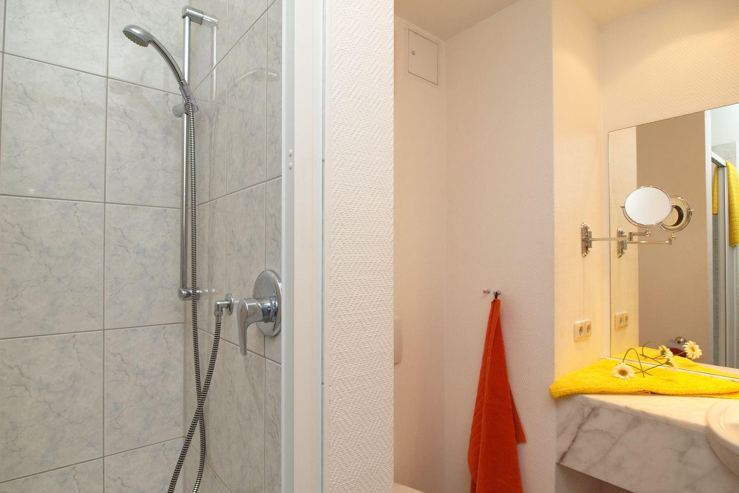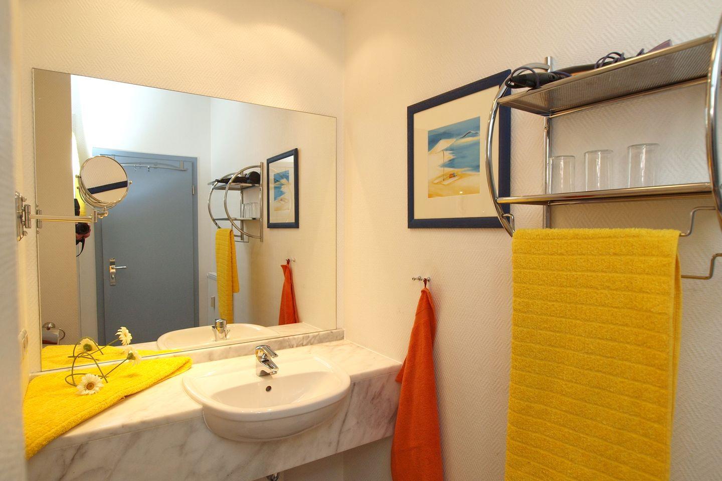 Die Ferienwohnung verfügt selbstverständlich auch über ein Duschbad mit WC, einen Föhn und einen Kosmetikspiegel.