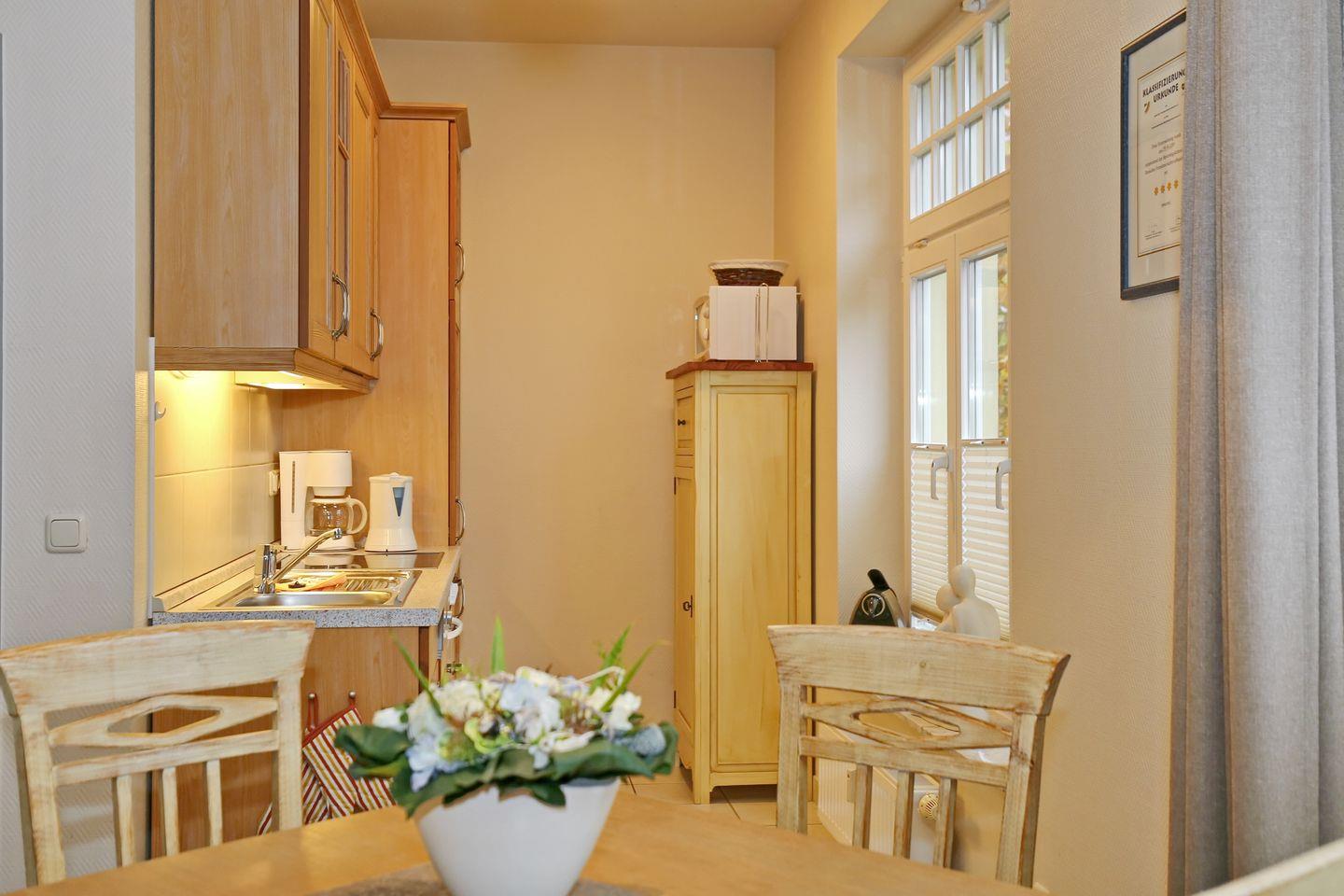 Die im Wohnzimmer integrierte Küchenzeile beinhaltet ein 4-Zonen-Cerankochfeld mit Backofen, einen Kühlschrank mit Gefrierfach, eine Mikrowelle und einen Geschirrspüler. Ebenso sind ein Wasserkocher, ein Toaster und eine Kaffeemaschine vorhanden.