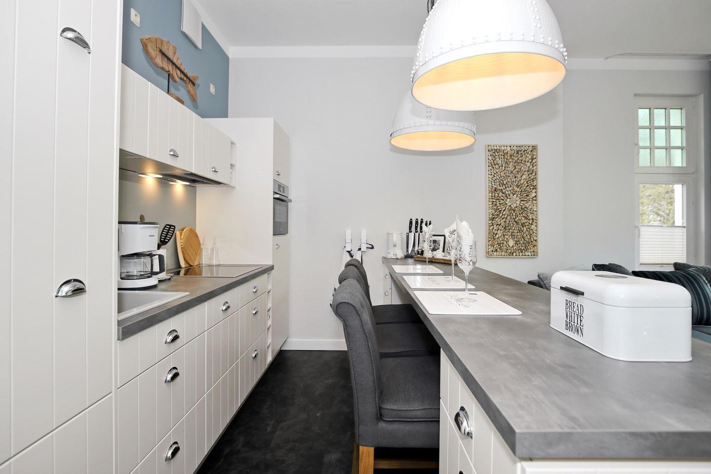 Die großzügige, hochwertige Einbauküche mit großem Mitteltresen und integriertem Essbereich ist mit einem Kühlschrank mit Gefrierfach, einem Geschirrspüler, einem Backofen und einem Herd mit 4-Zonen-Cerankochfeld voll ausgestattet. Natürlich stehen dir ein Toaster, eine Kaffeemaschine und ein Wasserkocher zur Verfügung.