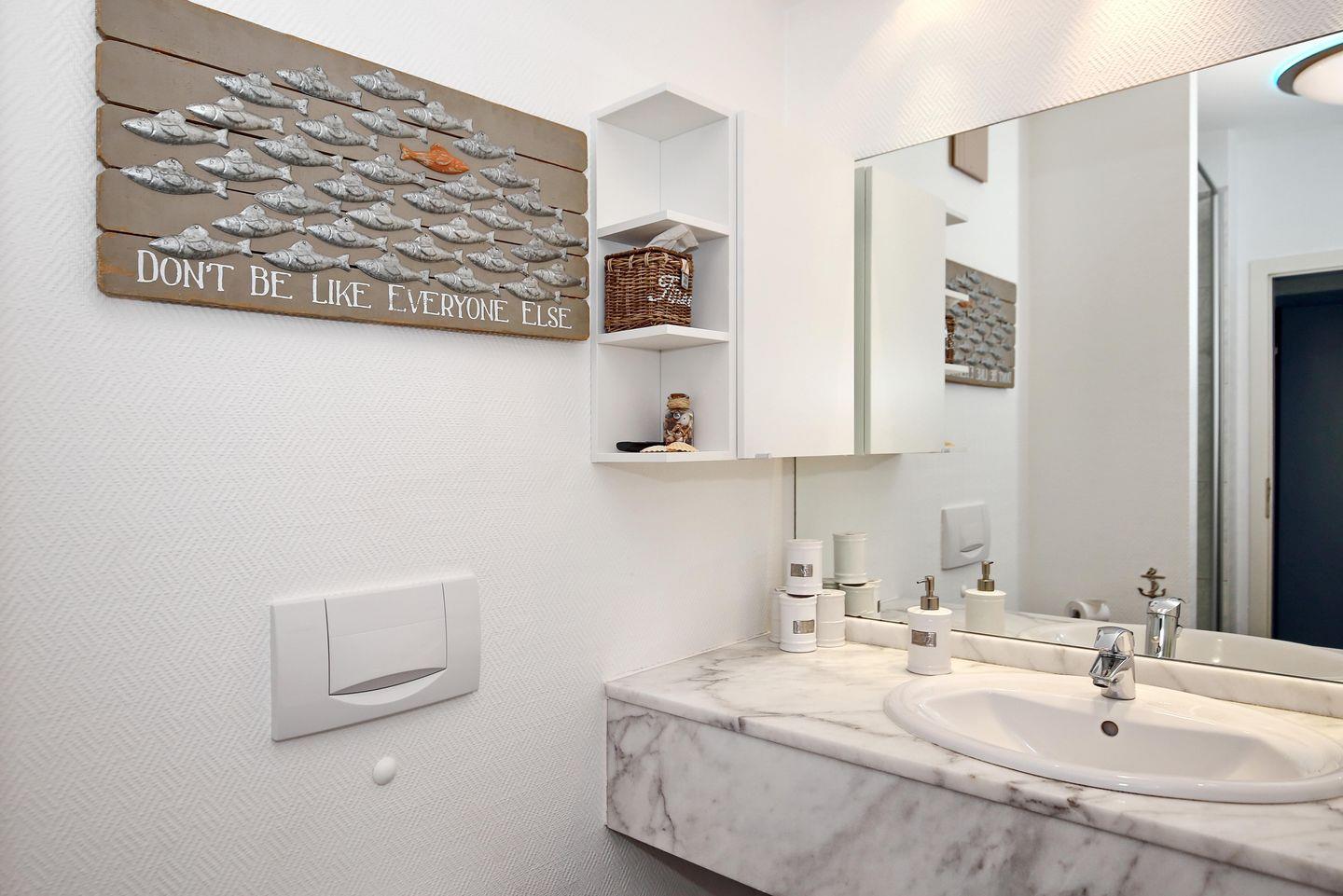 Die Ferienwohnung verfügt über ein gefliestes Duschbad mit WC. Für deine Waschutensilien findest du genügend Platz auf dem großzügigen Waschtisch. Ein Föhn und ein Kosmetikspiegel komplettieren die Ausstattung des Bades.