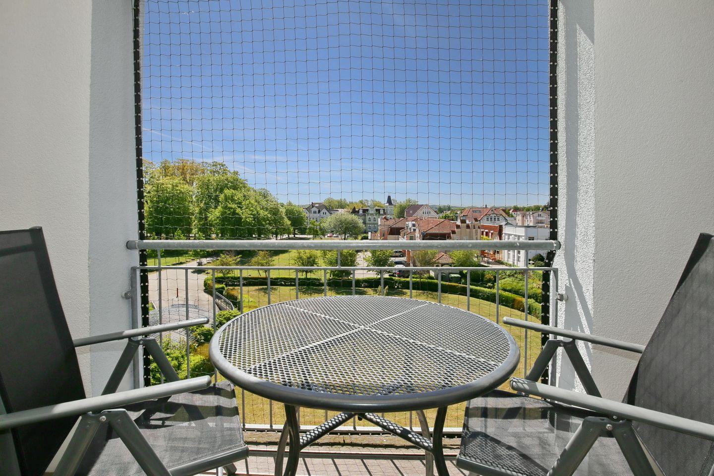 Deine gemütliche Ferienwohnung im Ostseebad Kühlungsborn befindet sich im 3. Obergeschoss auf der Südseite des Hauses und verfügt über einen möblierten Balkon mit Blick auf den Park. Mit einer Größe von 45 m² bietet die Wohnung mit einem Wohnbereich, einem Essbereich, einem Schlafzimmer, einer Küchenzeile und einem Badezimmer ausreichend Platz für einen erholsamen Ostseeurlaub. Die Entfernung zum Strand beträgt etwa 50 Meter.