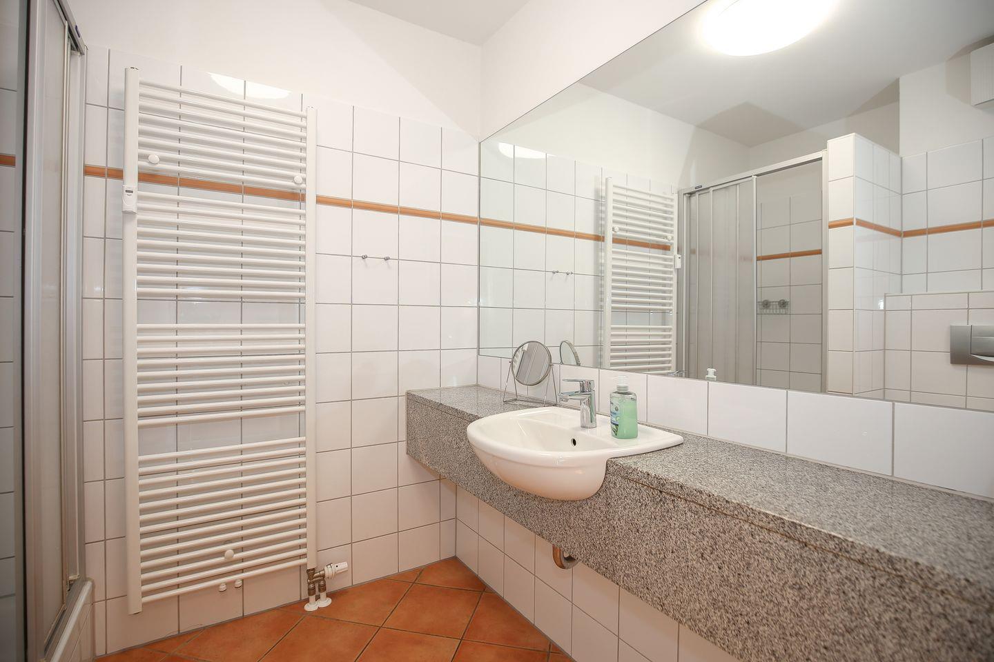 Die Ferienwohnung verfügt über ein gefliestes Duschbad und ein WC. Dir steht außerdem ein Föhn zur Verfügung. Für deine Waschutensilien findest du genügend Platz auf den Ablageflächen. Die gesamte Wohnung wurde gefliest, im Schlafzimmer wurde Vinyl verlegt.