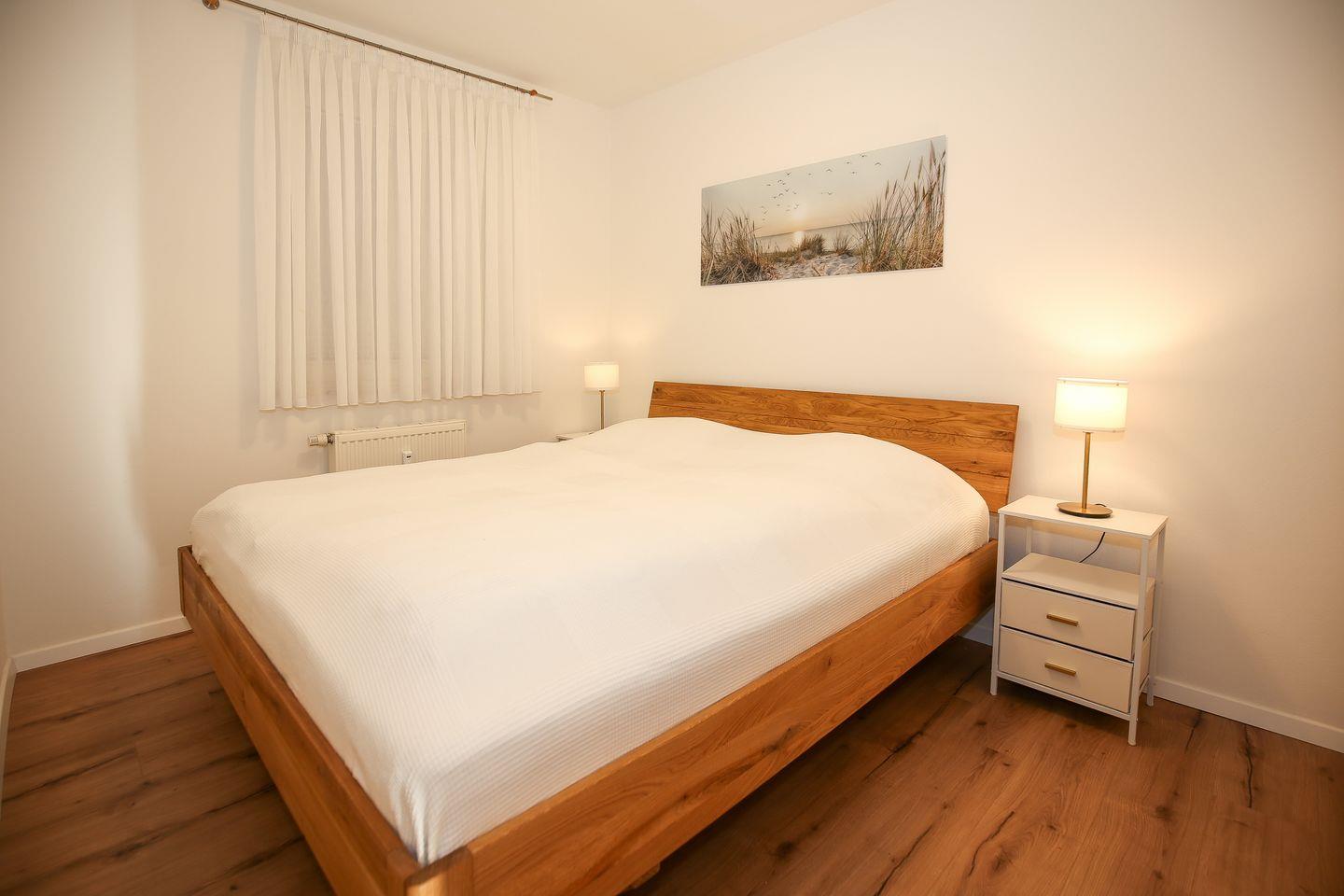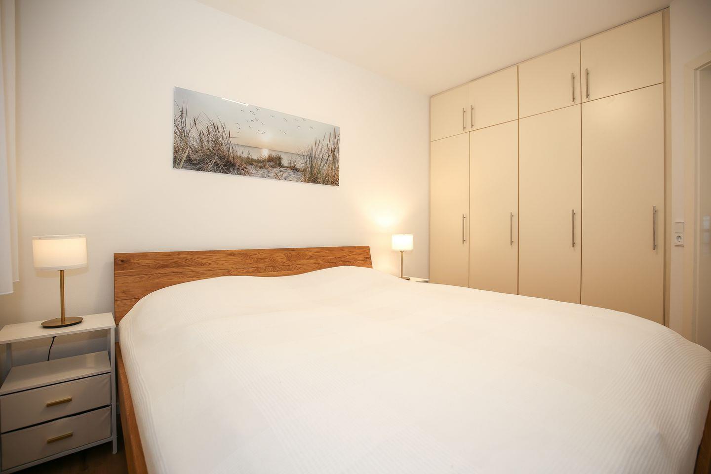 Im Schlafzimmer dieser Ferienwohnung lädt ein Doppelbett (2 x 90 x 200 cm) zum erholsamen Schlaf ein. Ein großer Kleiderschrank bietet viel Stauraum. (Das Schlafzimmerfenster geht zum Atrium raus)