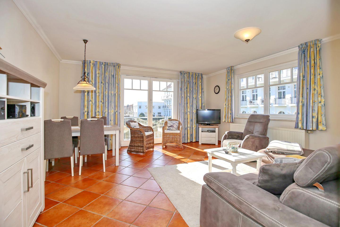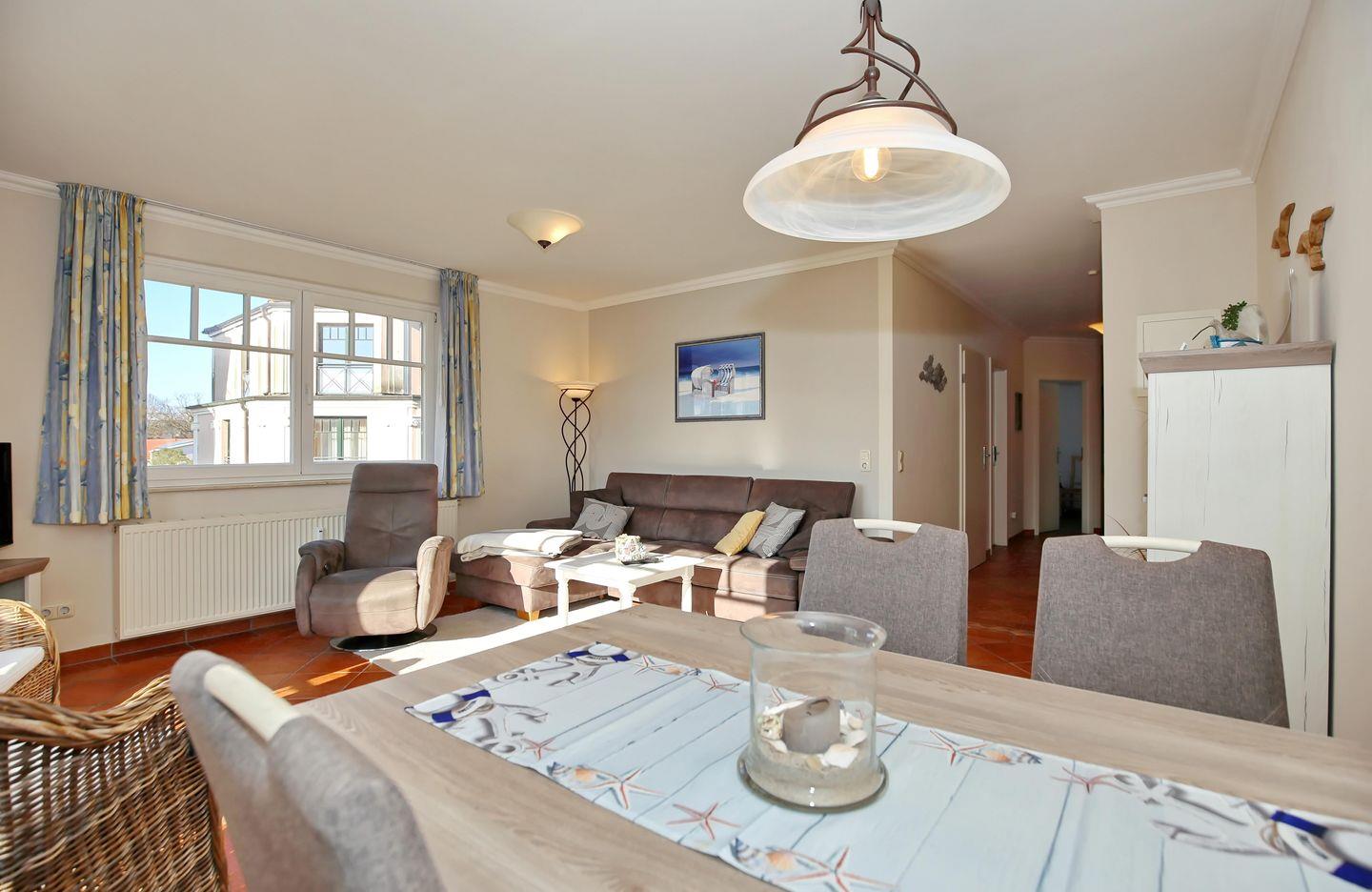 Die Ferienwohnung Nr. 115 in der Ferienanlage Meeresblick ist eine großzügige 3-Zimmer-Wohnung für bis zu 4 Personen. Die Wohnung liegt in der 1. Etage auf der Südwestseite des Hauses und hat keinen Balkon.