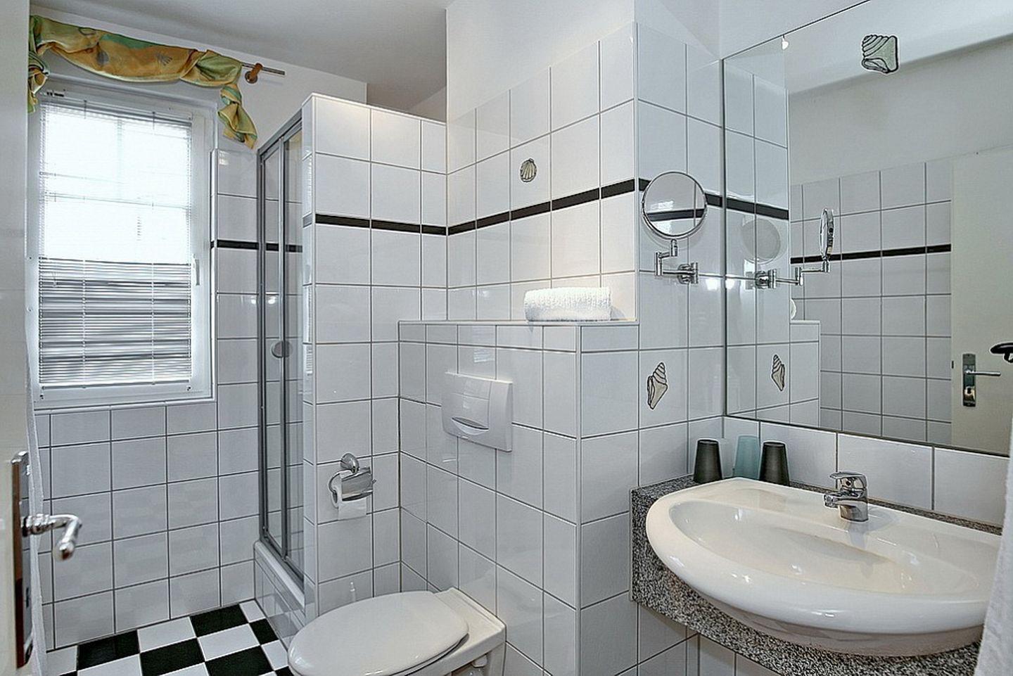 Die Ferienwohnung verfügt selbstverständlich auch über ein Duschbad mit WC, Föhn und Kosmetikspiegel.