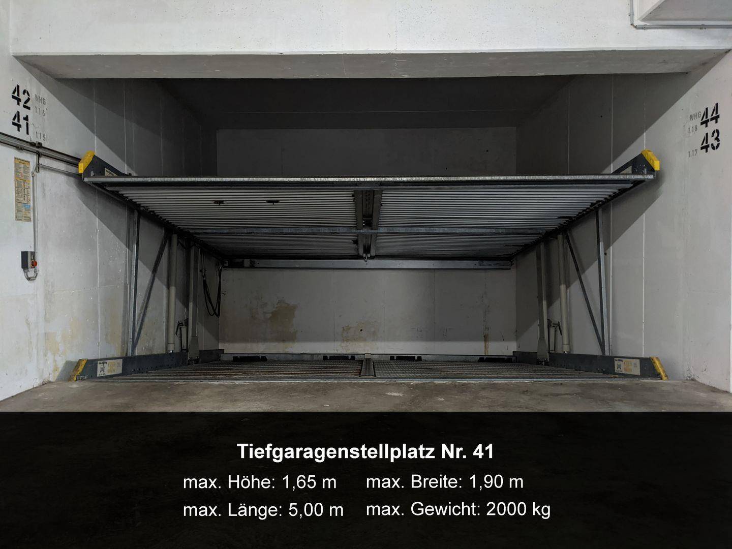 Zu der Wohnung gehört der Kfz-Stellplatz Nr. 41 in der Tiefgarage (max. Höhe 1,65 m, max. Gewicht 2.000 kg).