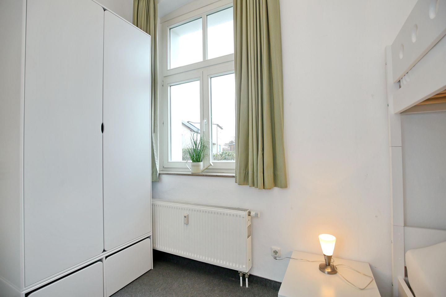 Die Ferienwohnung ist im ersten Schlafzimmer mit einem bequemen Doppelbett (2 x 90 x 200 cm) und im zweiten Schlafzimmer mit einem großen Etagenbett (90 x 200 cm) ausgestattet. Deine Garderobe findet in den Kleiderschränken Platz. Zur Verdunklung befinden sich an den Fenstern Vorhänge.