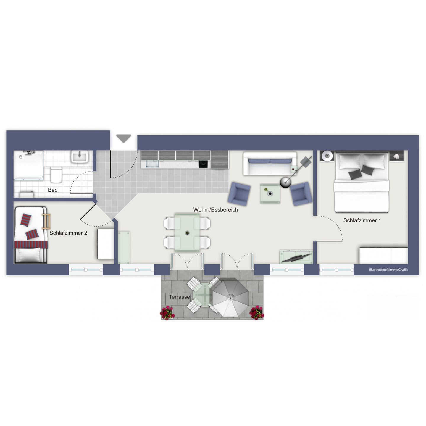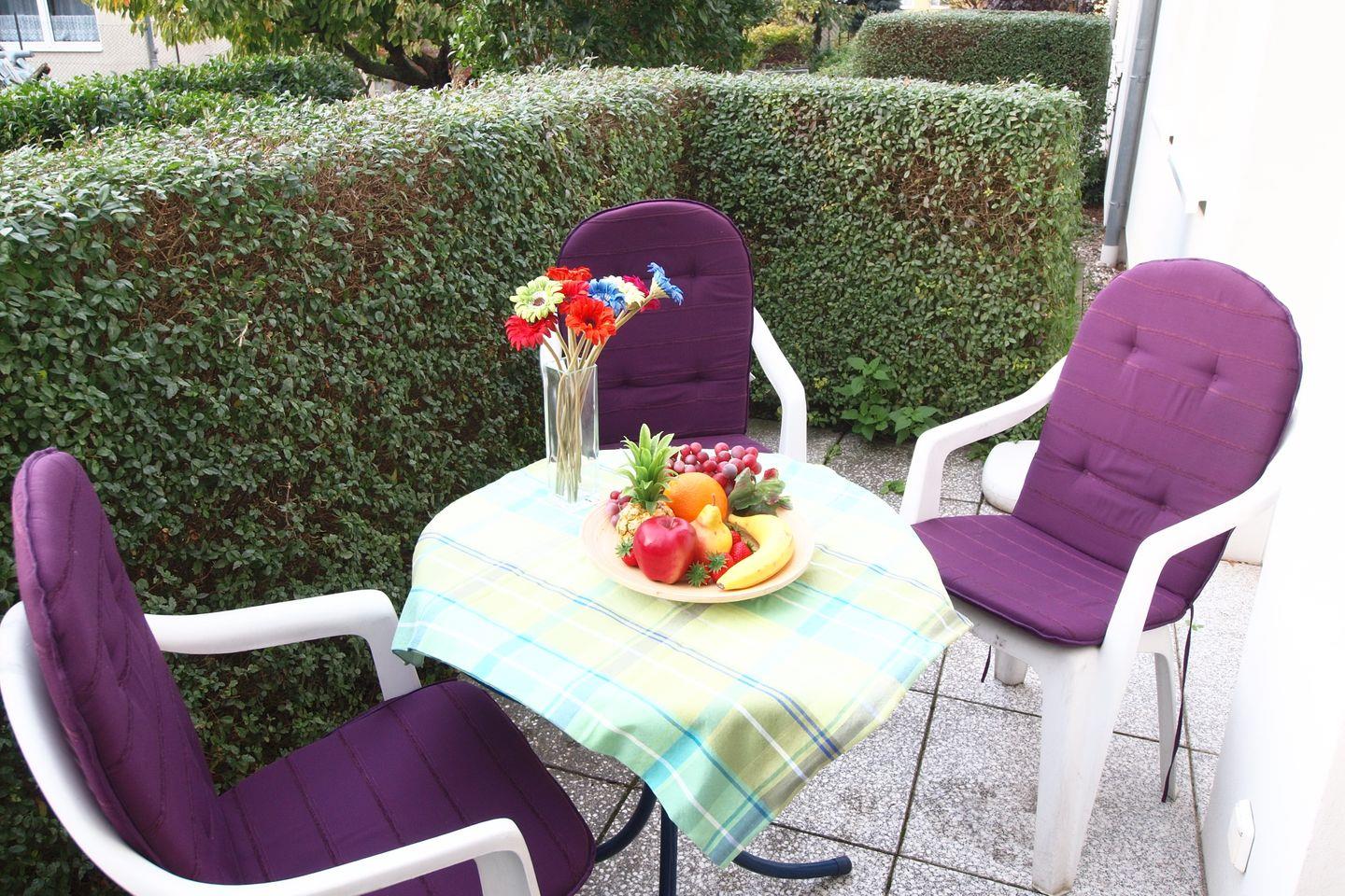 Vom Wohnraum aus gelangst du direkt auf die westlich ausgerichtete Terrasse, die am Nachmittag zum Verweilen bei einer Tasse Kaffee einlädt. Zur Ausstattung im Wohnbereich gehören selbstverständlich auch ein Flachbild-TV, ein Radio sowie ein WLAN-Anschluss, den du kostenlos nutzen kannst.