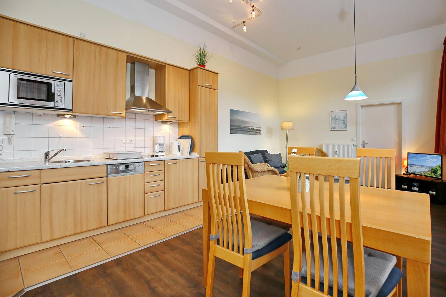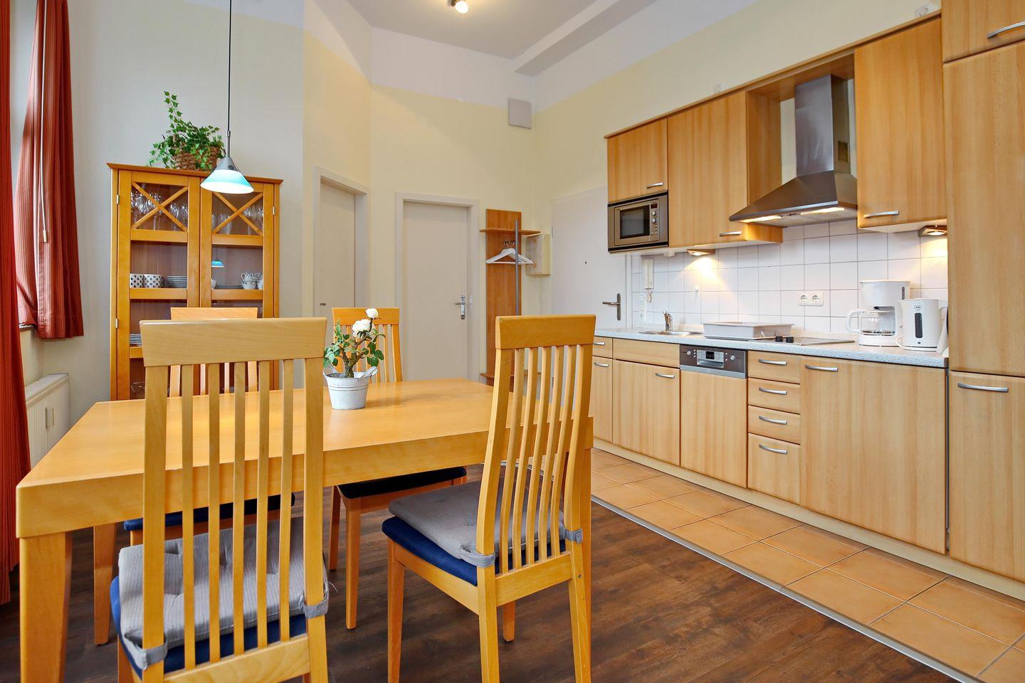 In der integrierten Küchenzeile stehen dir ein 2-Platten-Cerankochfeld, ein Kühlschrank mit Gefrierfach, eine Mikrowelle, ein Geschirrspüler sowie ein Toaster, eine Kaffeemaschine und ein Wasserkocher zur Verfügung. Am großen Esstisch ist genügend Platz für 4 Personen.