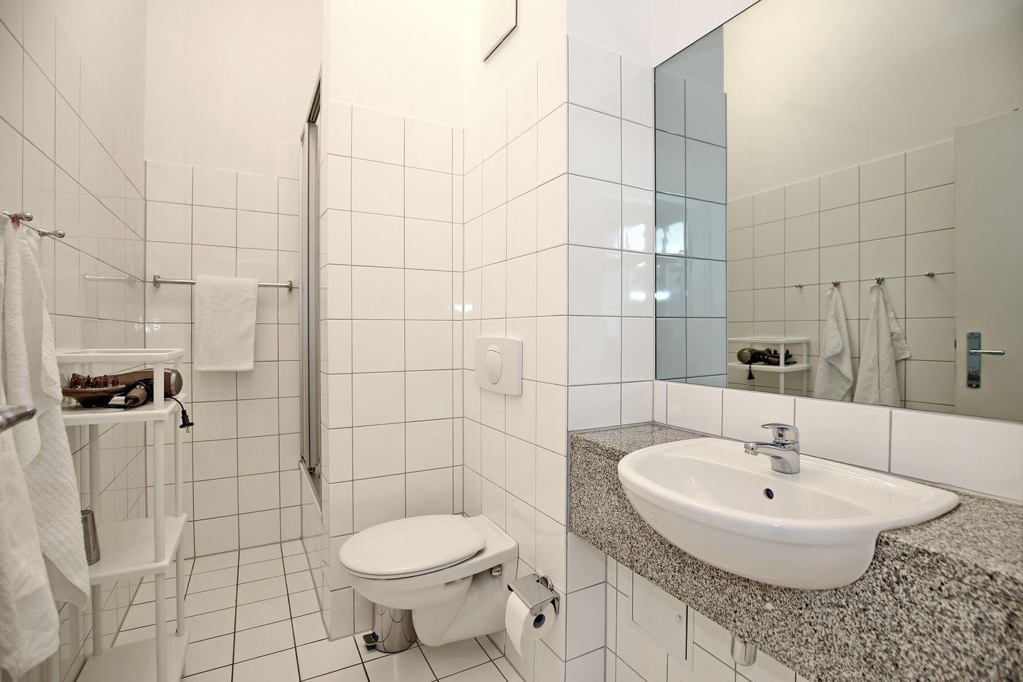 Weiterhin befindet sich in der Wohnung ein Duschbad/WC mit Föhn. Als Bodenbelag wurde Parkett im Wohnraum gewählt und Teppichboden in den Schlafzimmern.