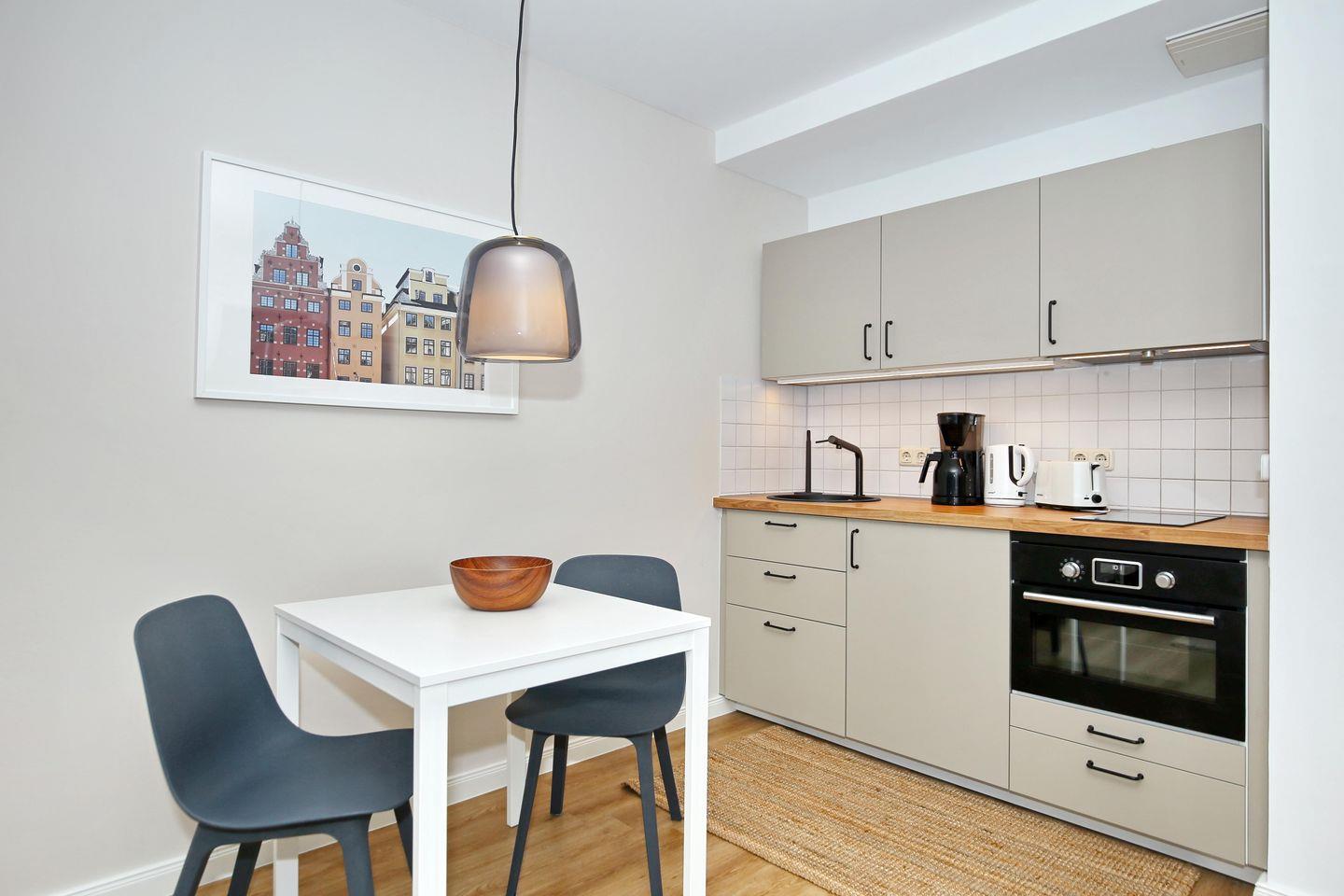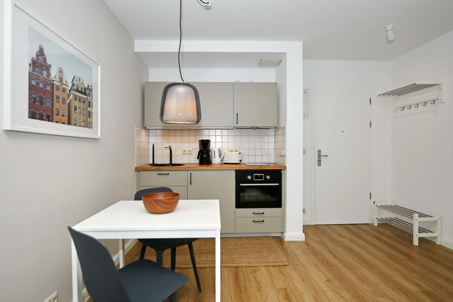 Die angrenzende Küchenzeile verfügt über 2-Cerankochfelder, einen Kühlschrank mit Gefrierfach, eine Mikrowelle, eine Kaffeemaschine, einen Wasserkocher und einen Toaster.