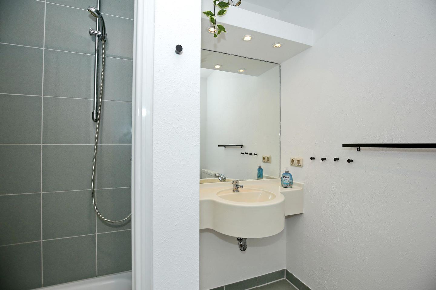 Das Bad der Ferienwohnung ist innenliegend. Hier stehen dir eine Dusche, ein WC, ein Waschbecken, ein Föhn und ein großer Spiegel zur Verfügung. Die gesamte Wohnung ist mit Design-Fußbodenbelag ausgelegt. Nur in den Nassbereichen gibt es einen Fliesenboden.