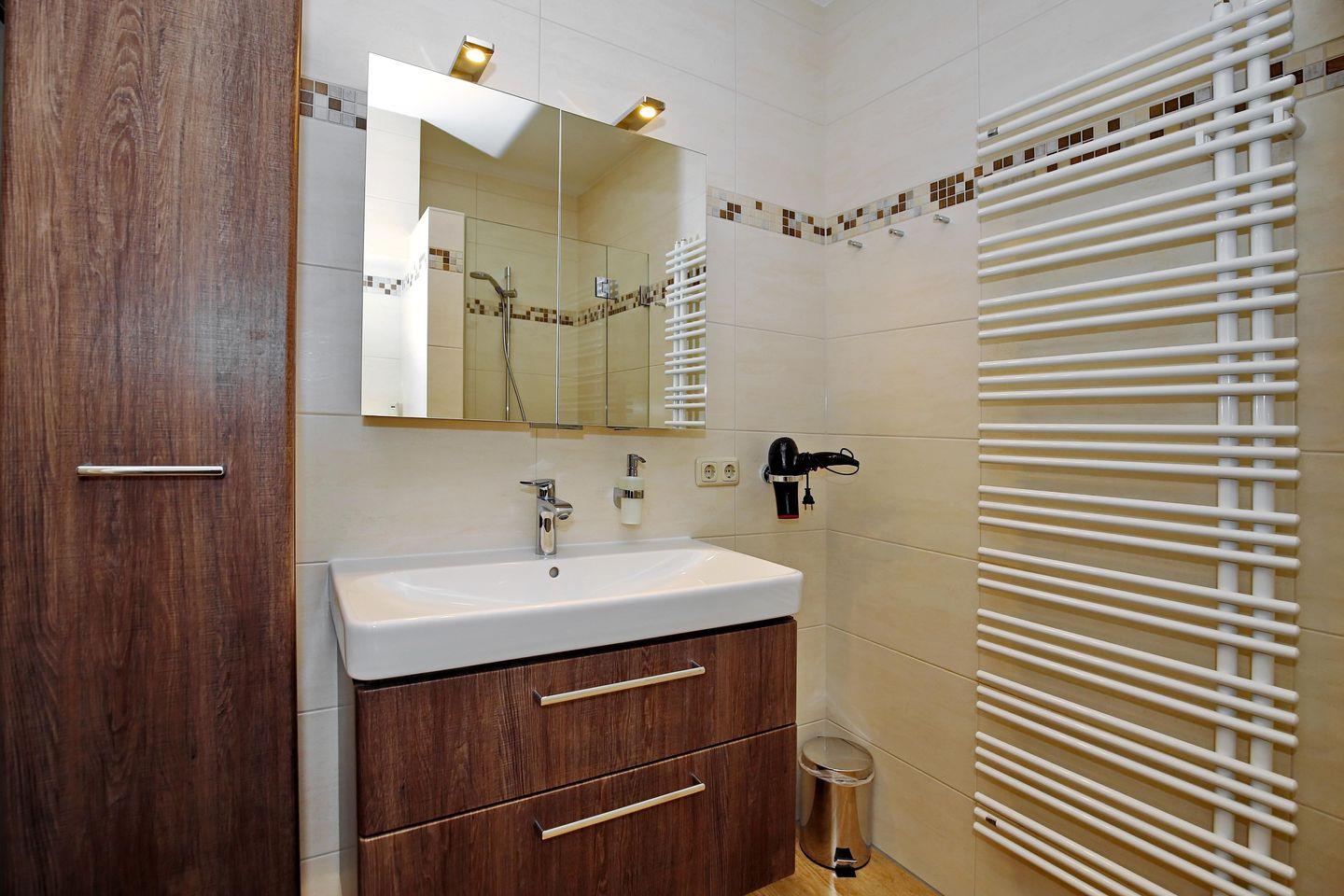 Die Ferienwohnung verfügt über ein Duschbad mit WC. Der durchgängige Waschtisch bietet viel Stauraum für deine Waschutensilien. Ein Föhn vervollständigt die Ausstattung des Bades. Der Küchenbereich sowie das Bad sind gefliest. Der Wohnbereich überzeugt mit einem Designbelag und einem Teppich. Im Schlafzimmer ist Teppichboden verlegt. Haustiere sind in dieser Nichtraucher-Wohnung nicht gestattet.