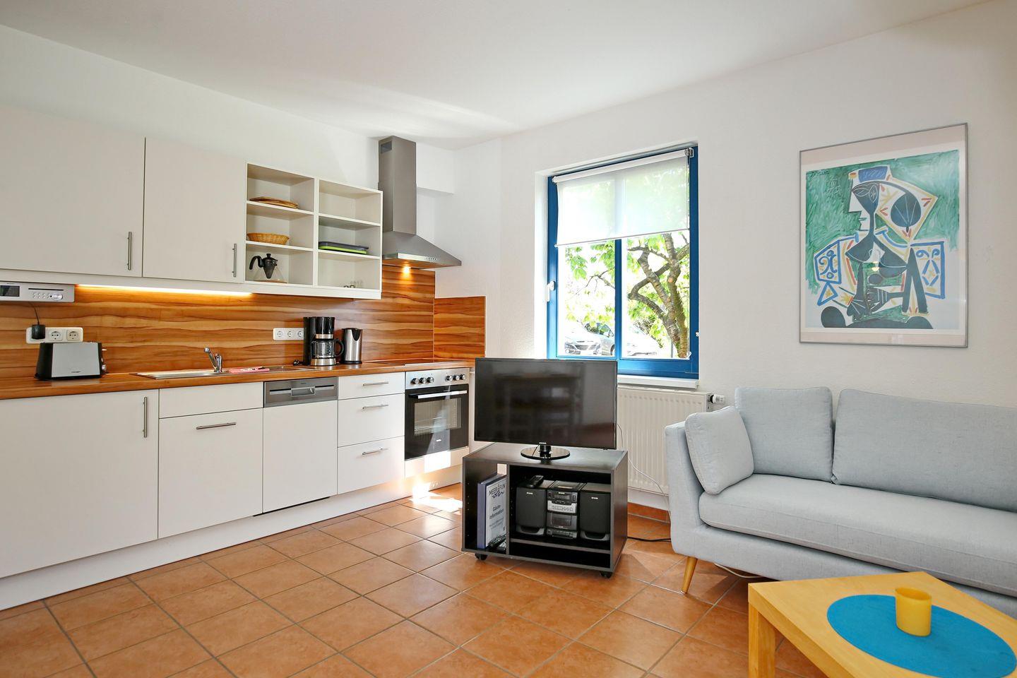 Die moderne Küchenzeile ist für dich mit einem Backofen mit 4-Platten-Cerankochfeld, einem Geschirrspüler, einem Kühlschrank mit Gefrierfach, einer Kaffeemaschine, einem Toaster und einem Wasserkocher voll ausgestattet.
